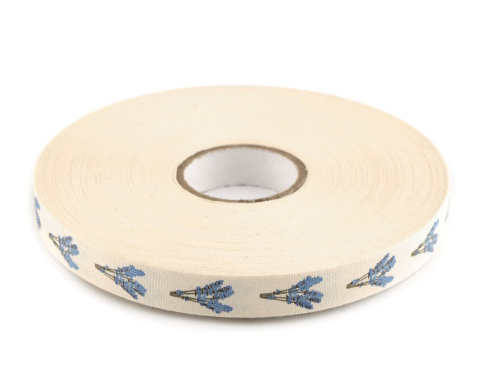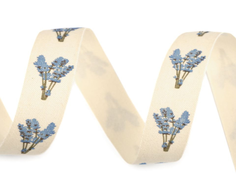 Bavlněnou stuhu zdobí květy levandule, které se výborně hodí k výrobě dekorací ve venkovském stylu provence. Kromě klasického využití k lemovaní ubrusů, zástěr či prostírání, lze stuhu využít také na scrapbooking nebo balení dárků.
