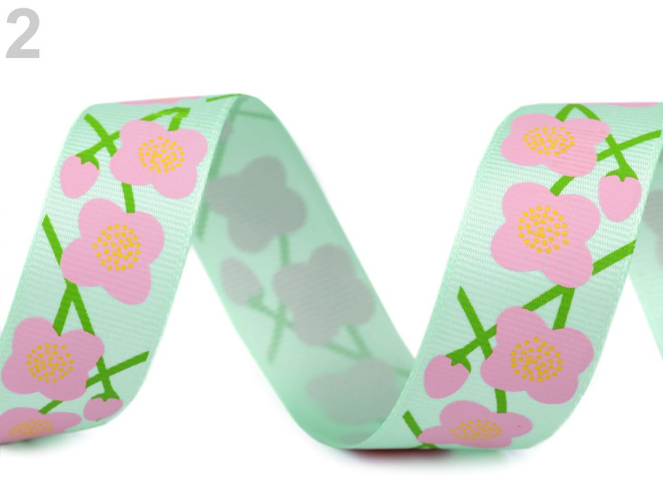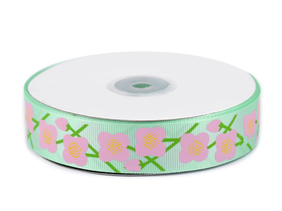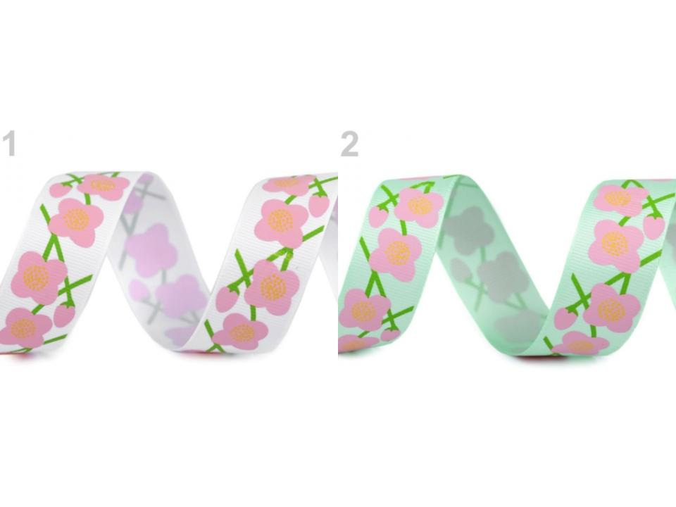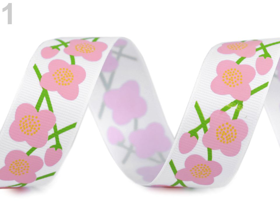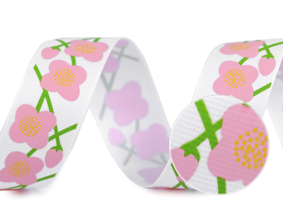 Rypsová stuha s potiskem květů má na povrchu typické jemné žebrování. Potisk je jednostranný.