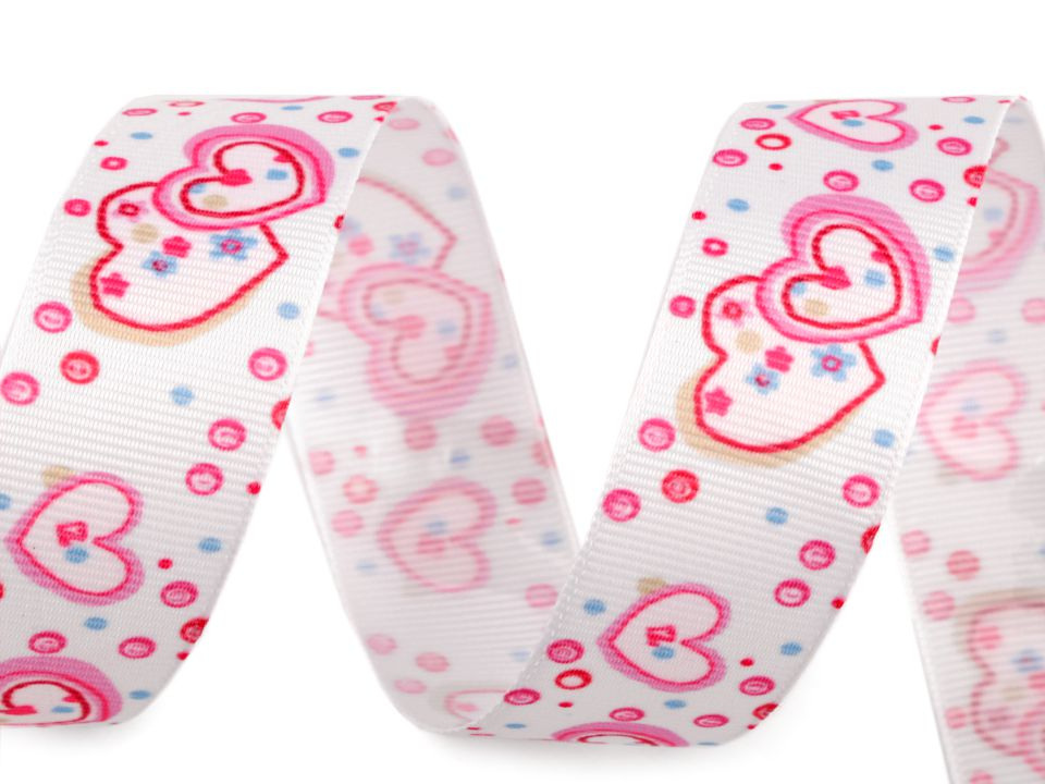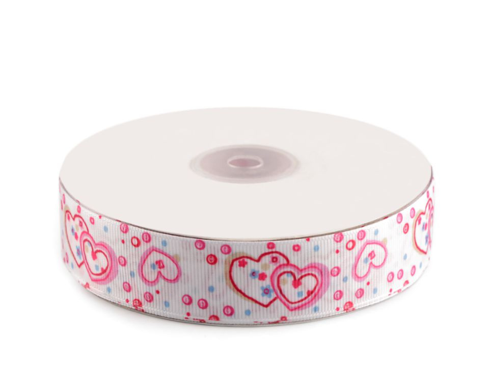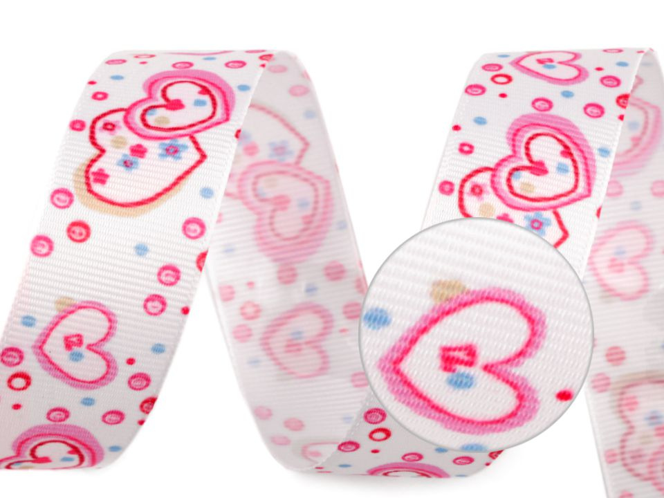 Rypsová stuha se srdíčkovým potiskem má na povrchu typické jemné žebrování. Potisk je jednostranný.