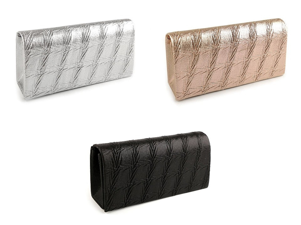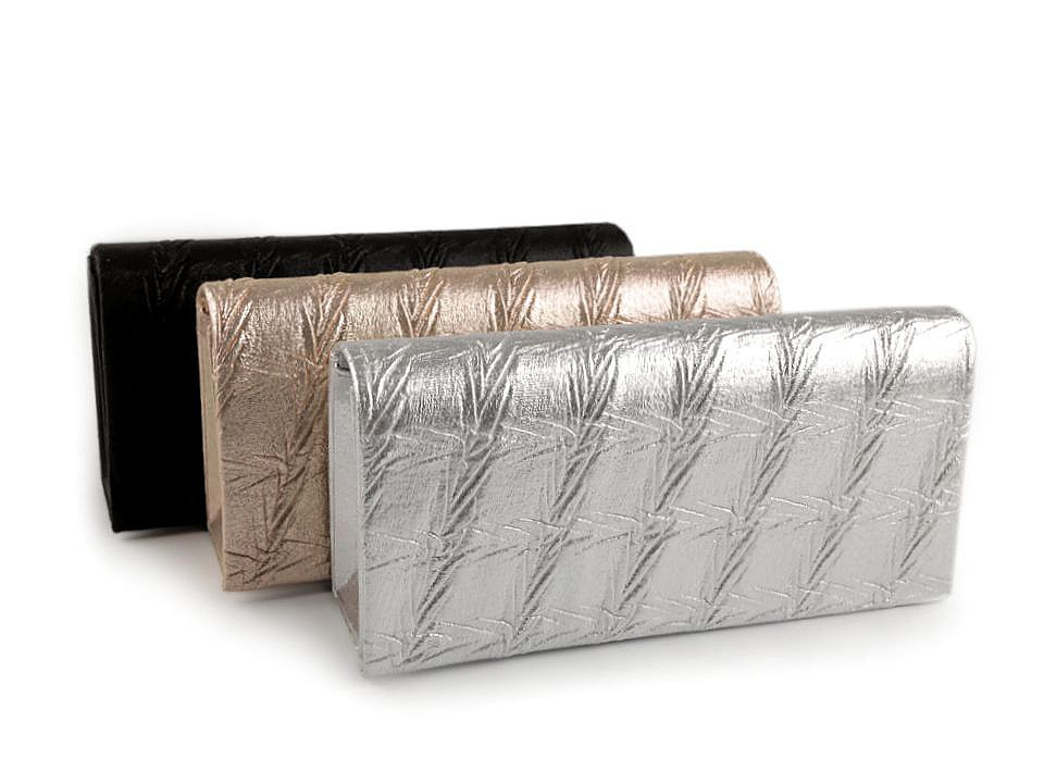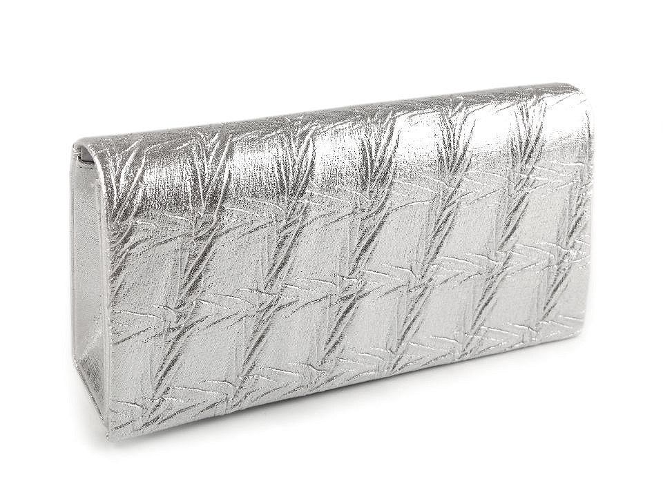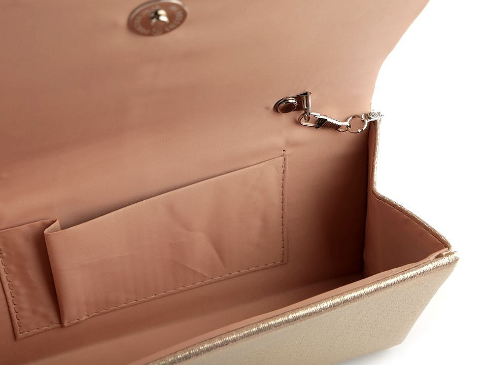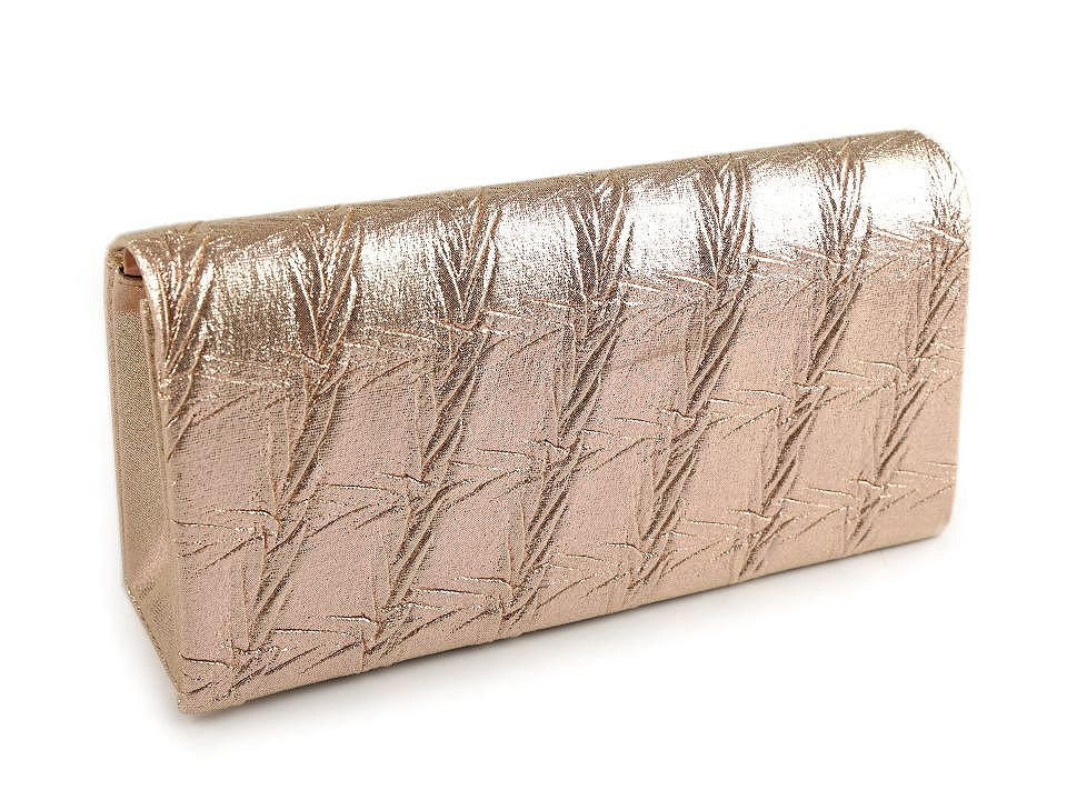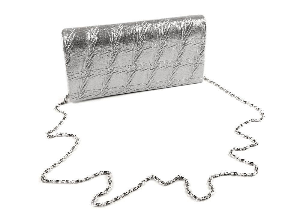 Metalické psaníčko má na přední straně zajímavě nařasenou látku, která vytváří efektní odlesky. Psaníčko je vyztužené, uvnitř má polyesterovou podšívku a malou kapsičku na drobnosti. Zapíná se na magnet. K psaníčku patří odepínatelný řetízek - můžete nosit s řetízkem přes rameno nebo bez něj jen tak v ruce.