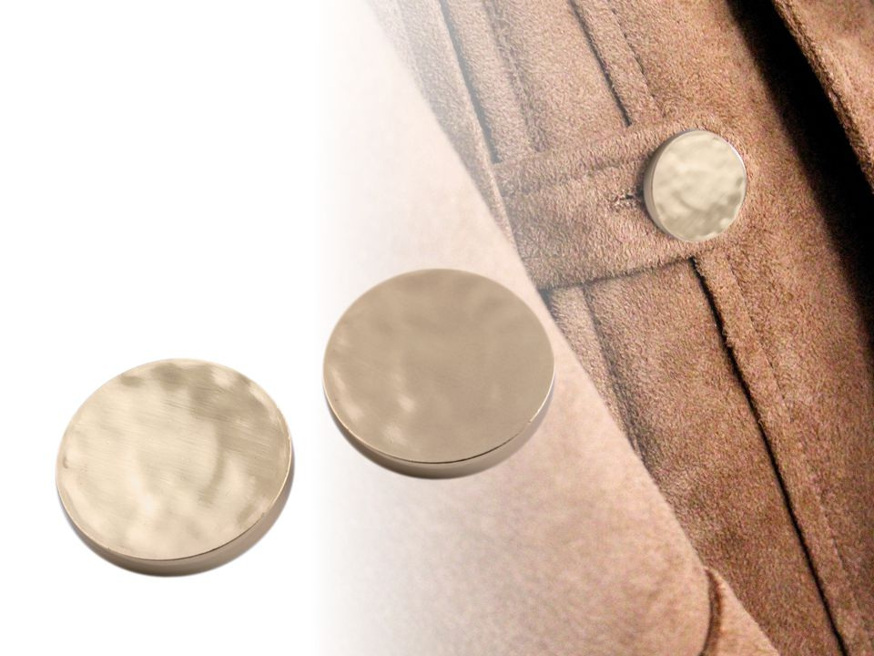 Ploché kovové knoflíky vás na první pohled zaujmou svým neopracovaným vzhledem. Jsou lehké, vyrobené z nemagnetického kovu a díky spodnímu přišívání jsou vhodné k našití na saka, kabáty, svetry nebo také na doplňky jako jsou kabelky, tašky či batohy.