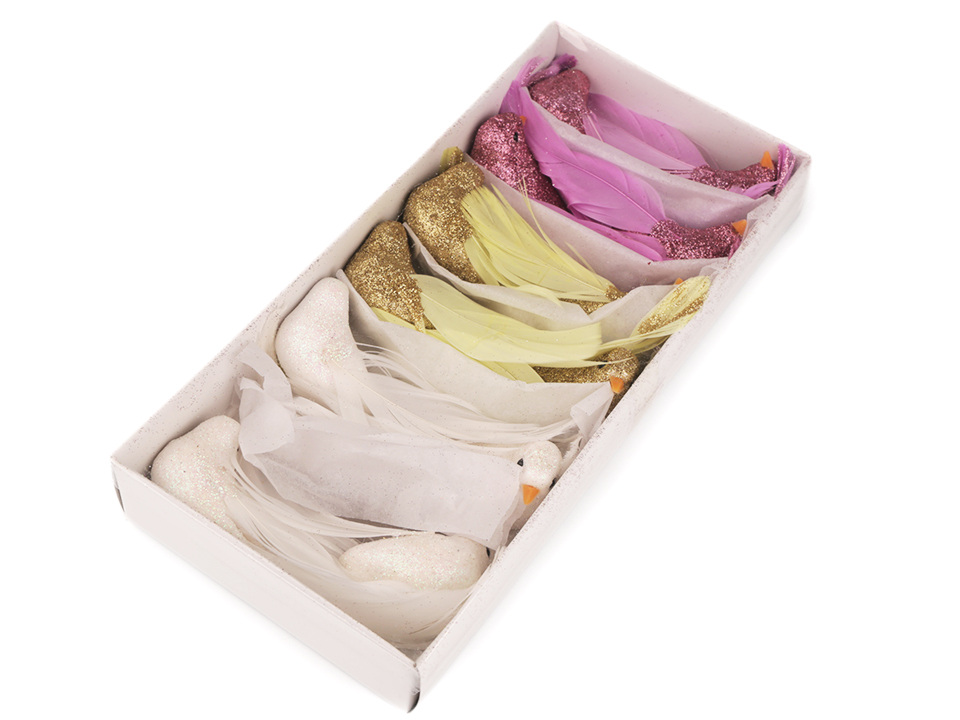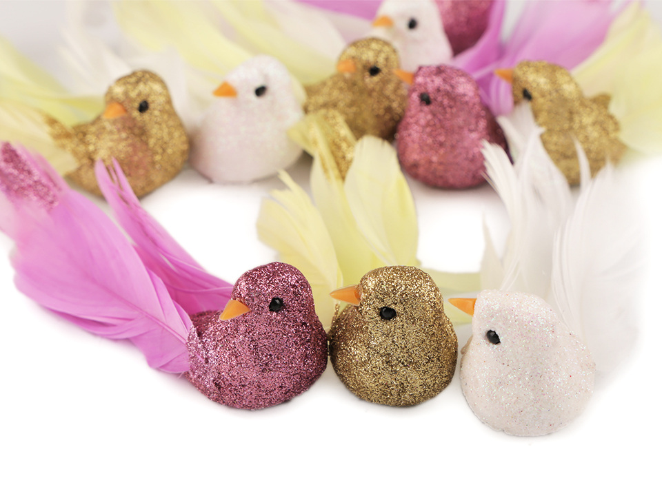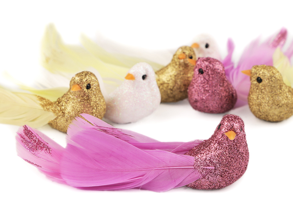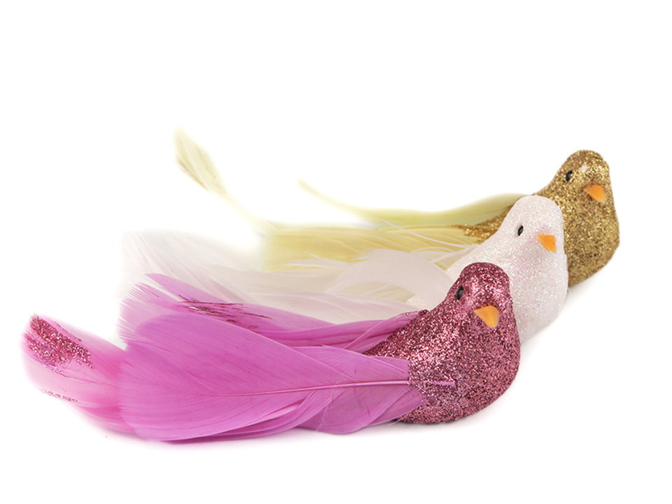 Dekorační ptáček působí díky třpytivým glitrům luxusně. Křídla a ocásek má z peří. Ptáčka můžete zakomponovat do vánočních i svatebních dekorací. Je vhodný k nalepení na věnce, krabičky i dárky.