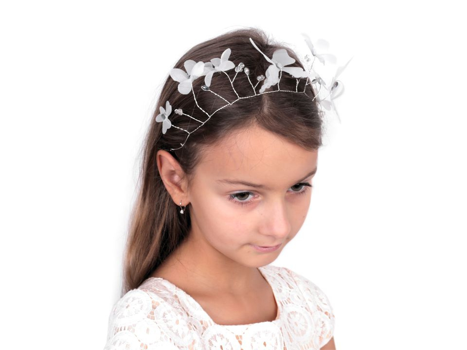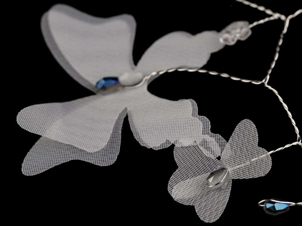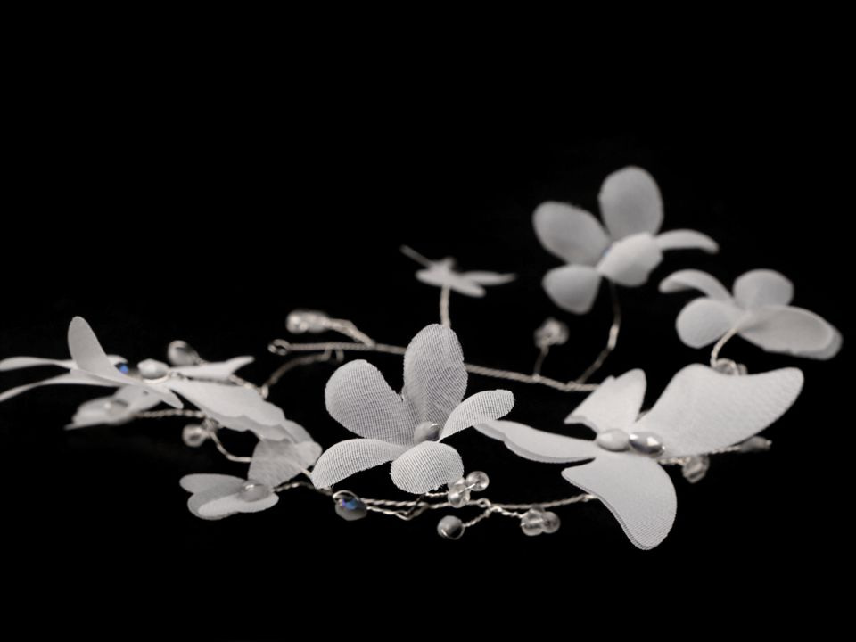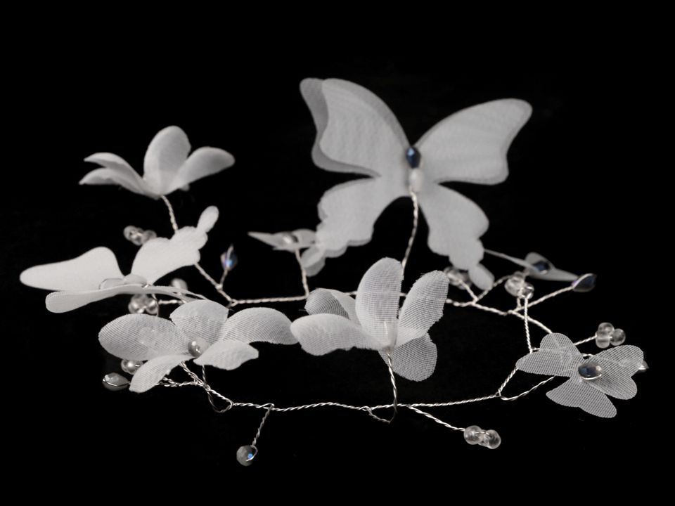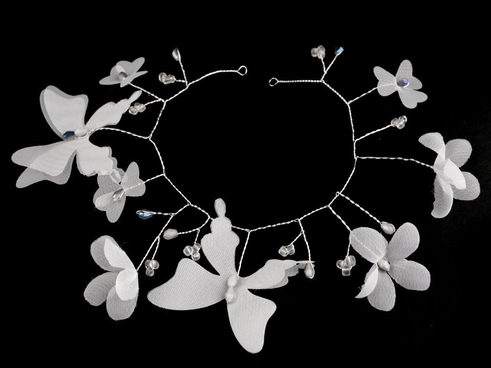 Elegantní ozdoba s květy a motýly do vlasů originálně doplní a zároveň zjemní váš účes. Zdobí ji broušené korálky s AB efektem. Využijete ji jako doplněk na svatbu, do tanečních, do divadla, na večírky, na ples nebo na svaté přijímání.
