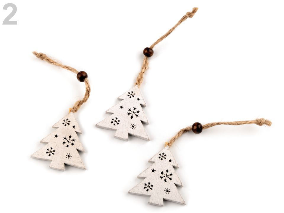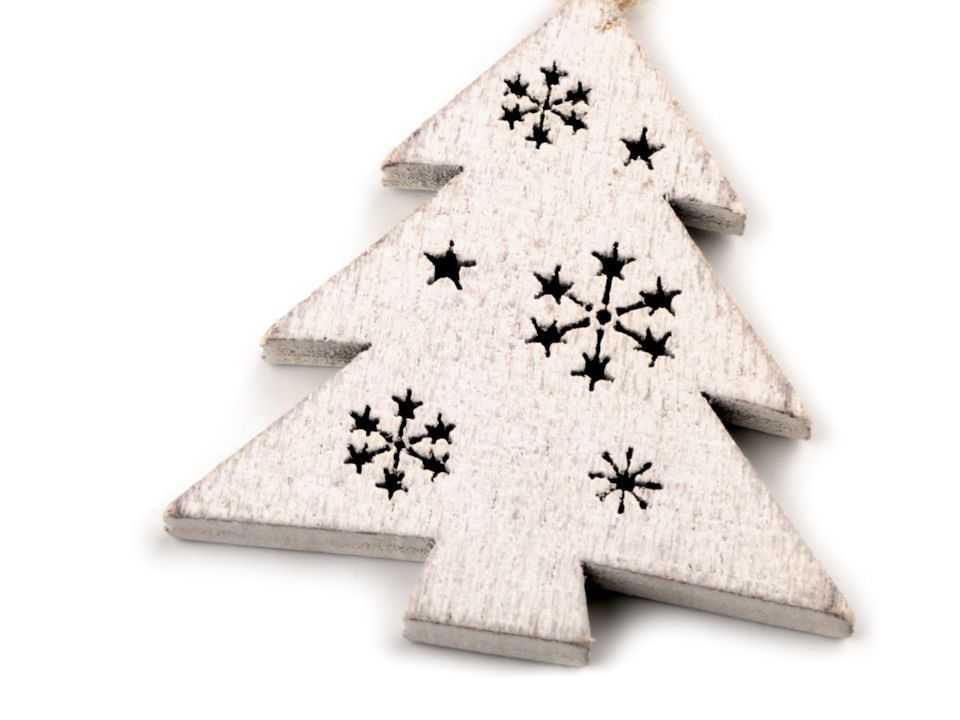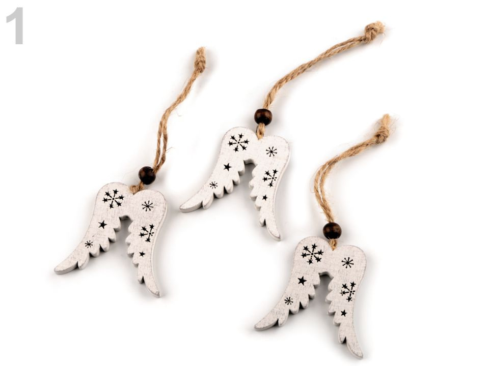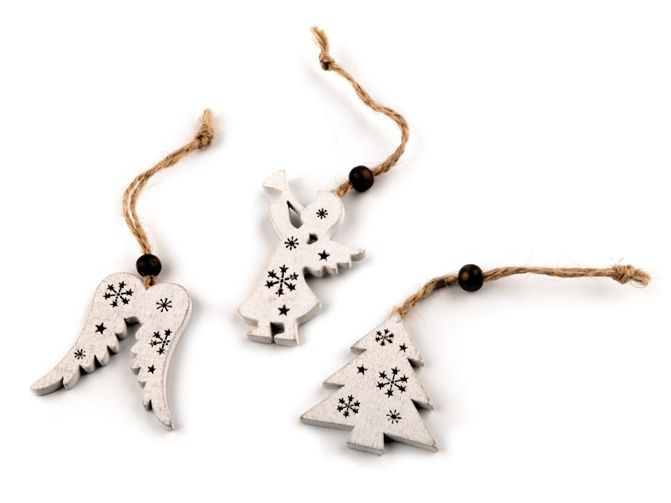Dřevěné vánoční dekorace ve tvaru křídel, stromku a anděla vynikají svým vintage zpracováním. Mají v sobě výřezy vloček. Díky připevněnému poutku z juty a korálku je můžete pověsit na stromek, na dveře, do oken nebo volně do prostoru. Zaujmou také jako ozdoba na slavnostně zabaleném dárku.