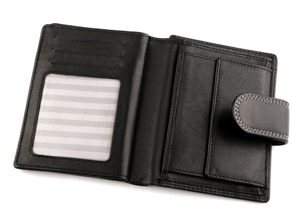 Peněženka č.1 má uzavírání na zápinku na patent, až 15 přihrádek na kreditní karty, 1 průhlednou přihrádku, 2 dlouhé přihrádky na rozložené bankovky. Mincovník má tvar rozkládací kapsy, zapíná se na klopu na patentku.