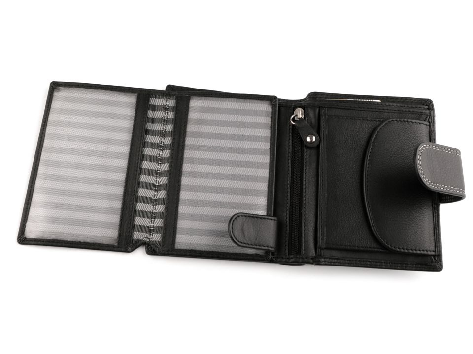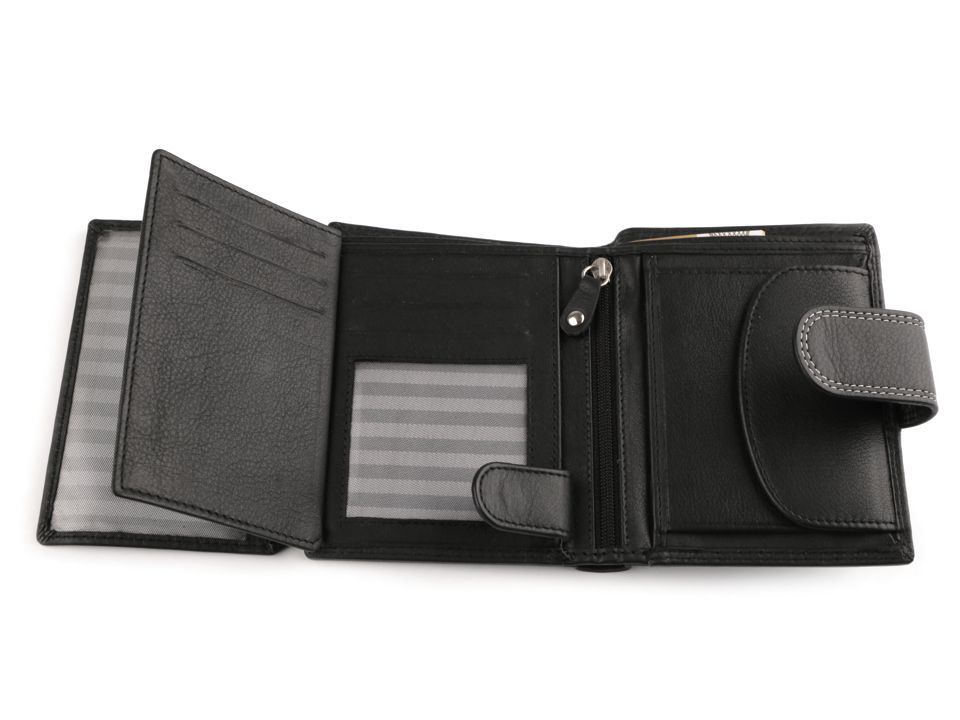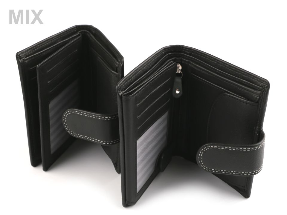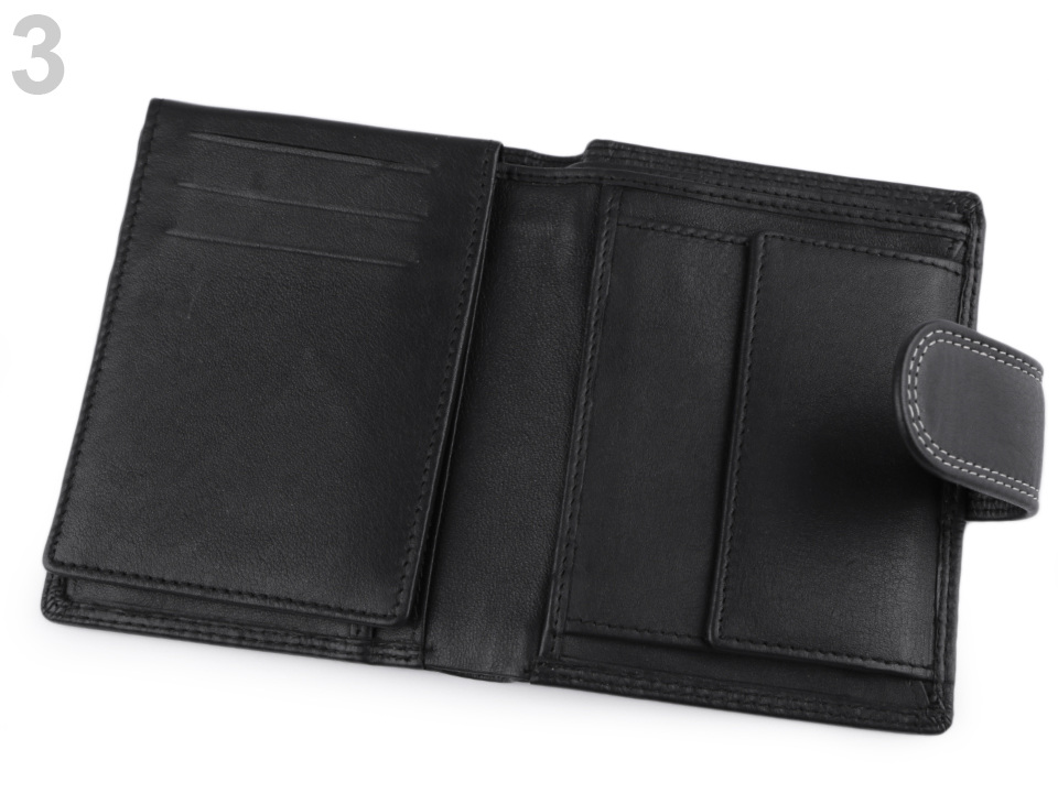 Peněženka č.3 má uzavírání na zápinku na patent, až 13 přihrádek na kreditní karty, 2 dlouhé přihrádky na rozložené bankovky. Mincovník má tvar rozkládací kapsy, zapíná se na klopu na patentku.
