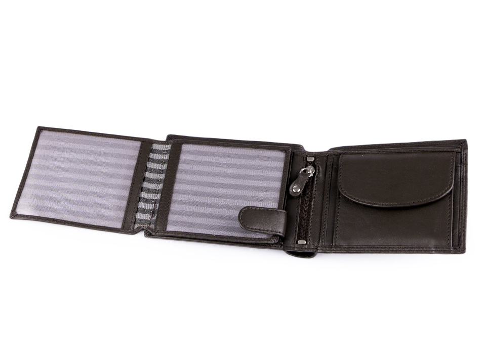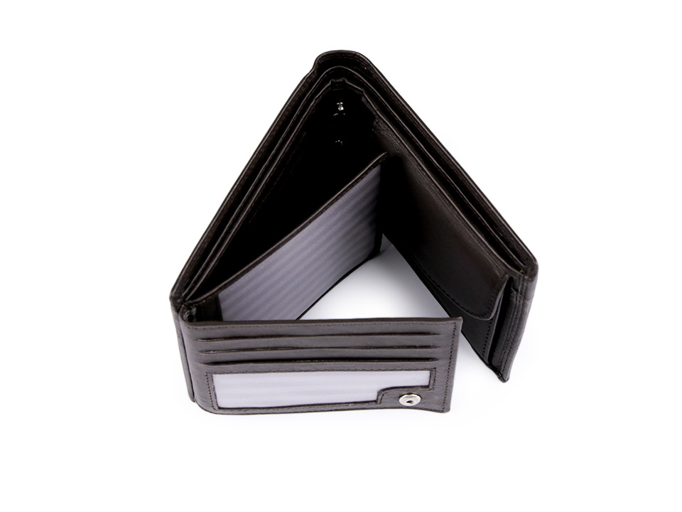Peněženka č.3 má 2 velké přihrádky na rozložené bankovky a 7 přihrádek na karty. Mincovník má tvar rozkládací kapsy, zapíná se na klopu na patentku.