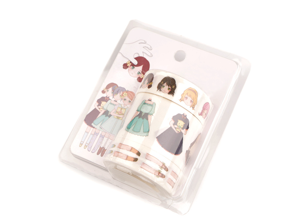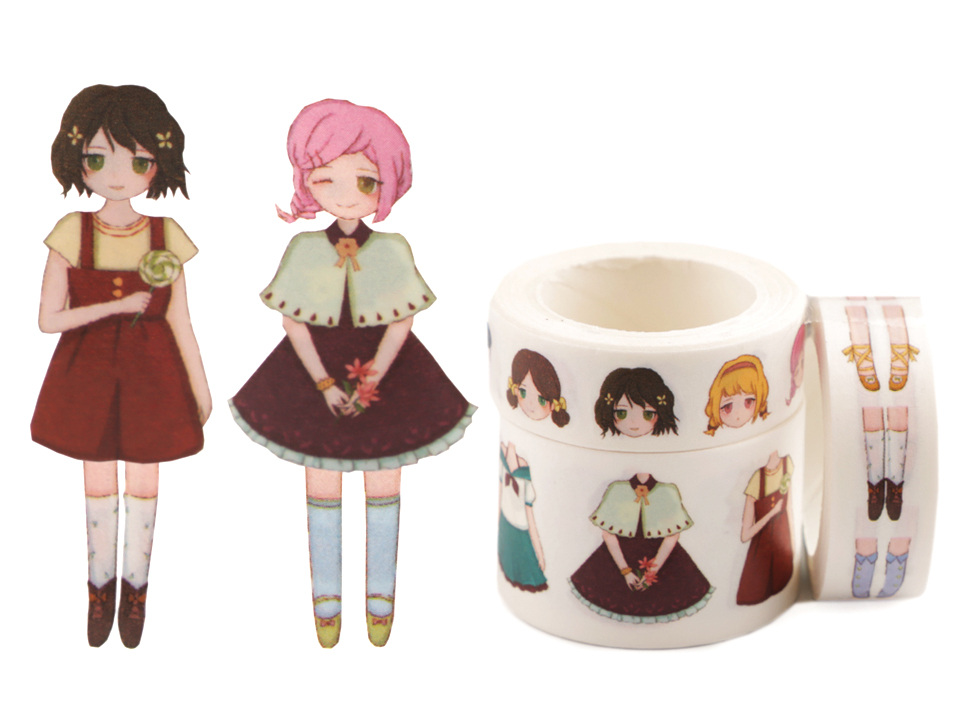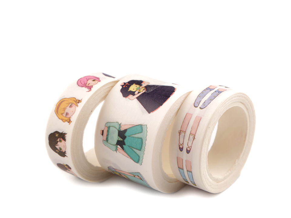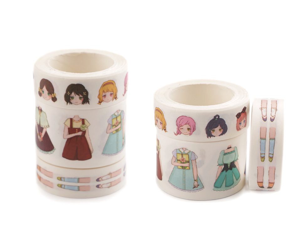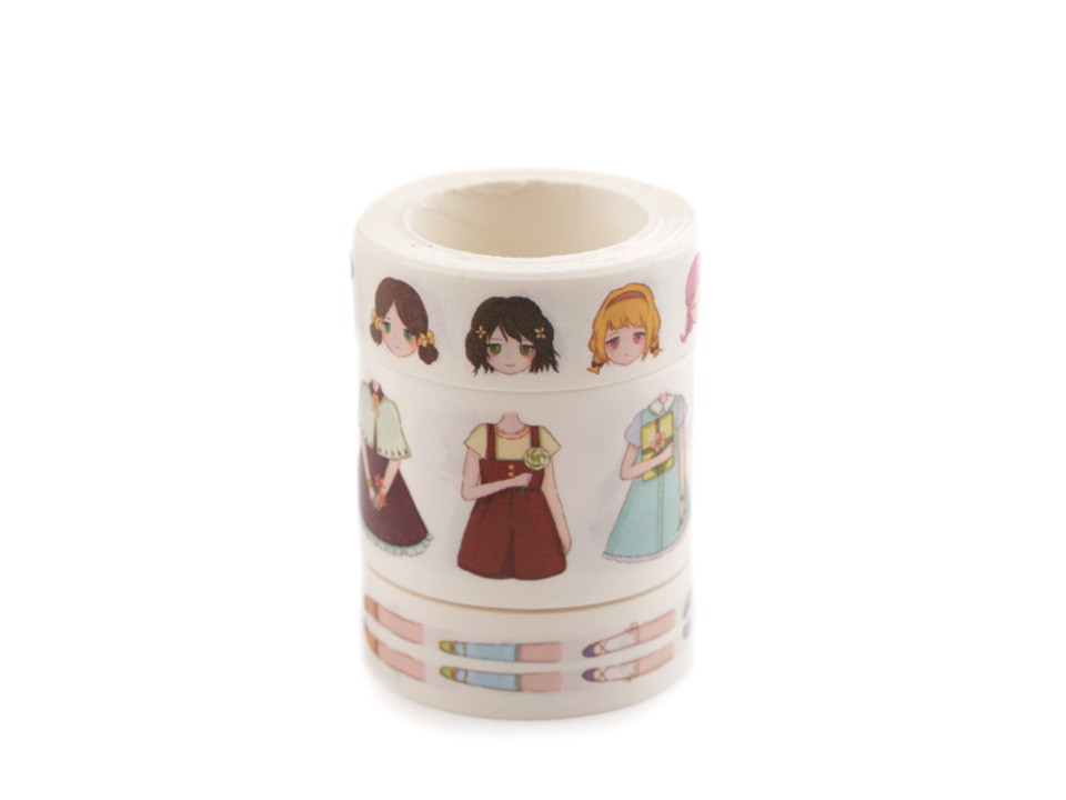 Lepicí washi pásky jsou v sadě po 3 kusech - každá páska obsahuje jiné obrázky (hlavy holčiček, šaty a nohy) - můžete si tak sestavit vlastní holčičku, která vám ozdobí diáře, přáníčka, pozvánky, krabičky apod.