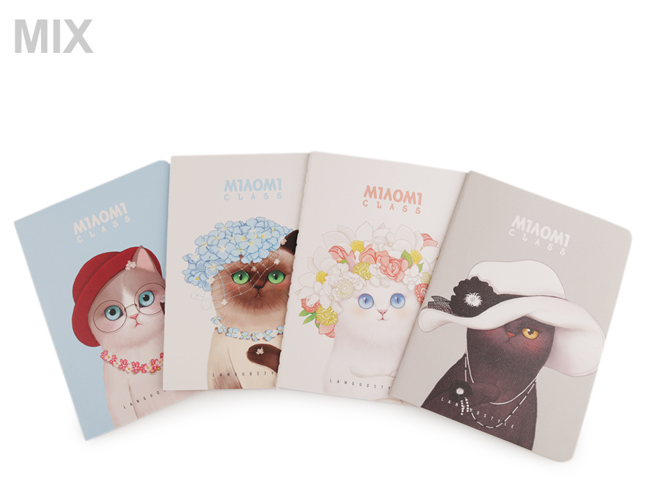 Barevný zápisník velikosti A6 si oblíbí každý milovník koček. Měkké desky jsou zpevněné matnou povrchovou laminací. Sešit je linkovaný a obsahuje 22 listů papíru s roztečí linek 8 mm. Na horní a dolní lince jsou tečky s roztečí 1 cm, které můžete spojit a jednoduše tak vytvořit svislé linky.