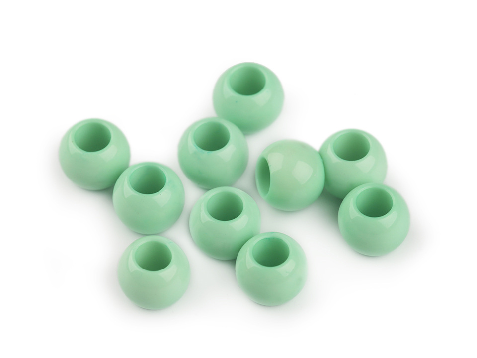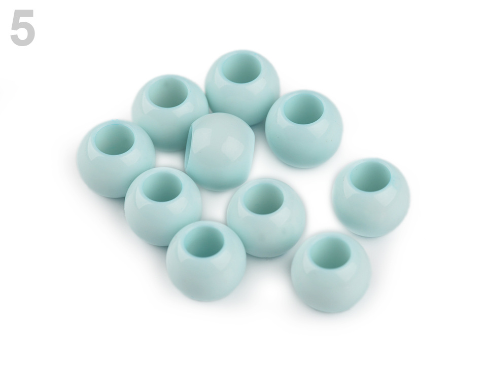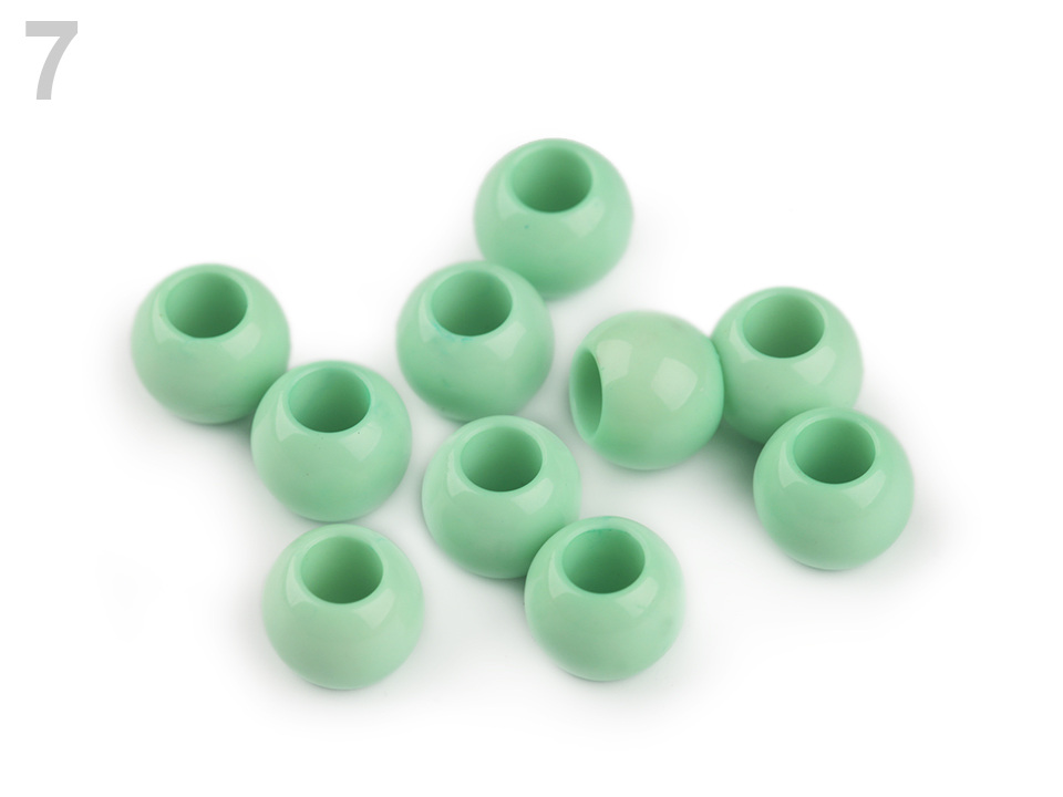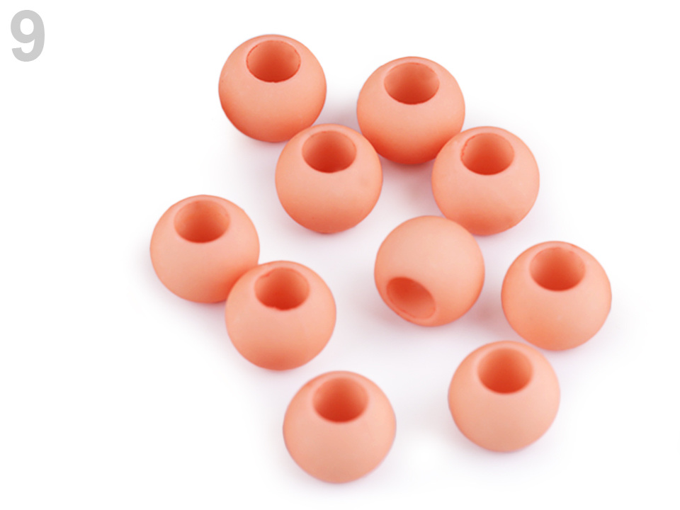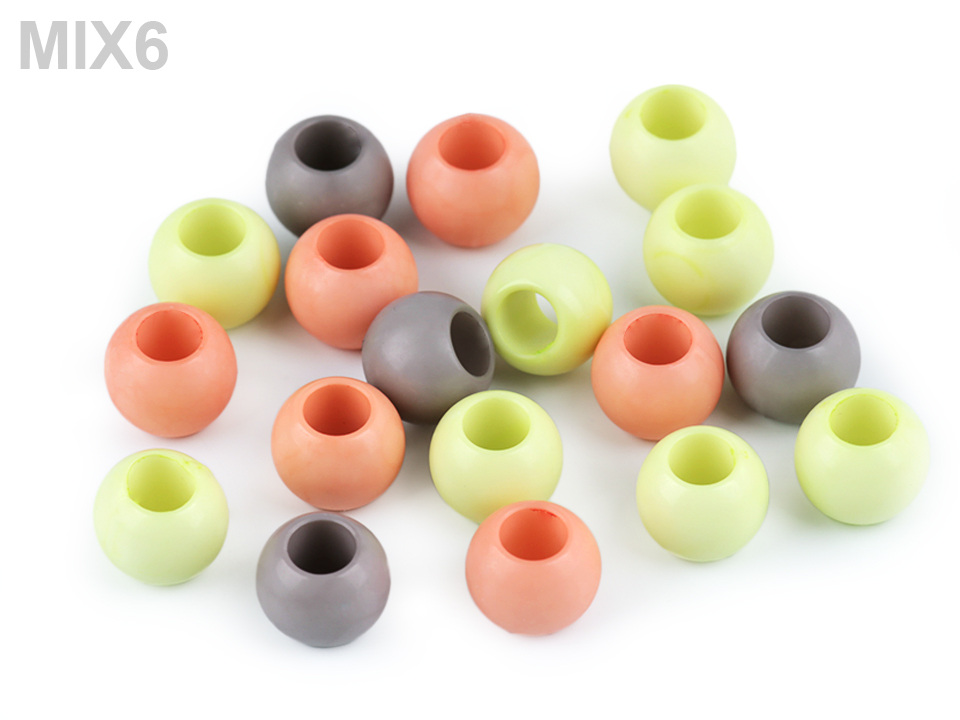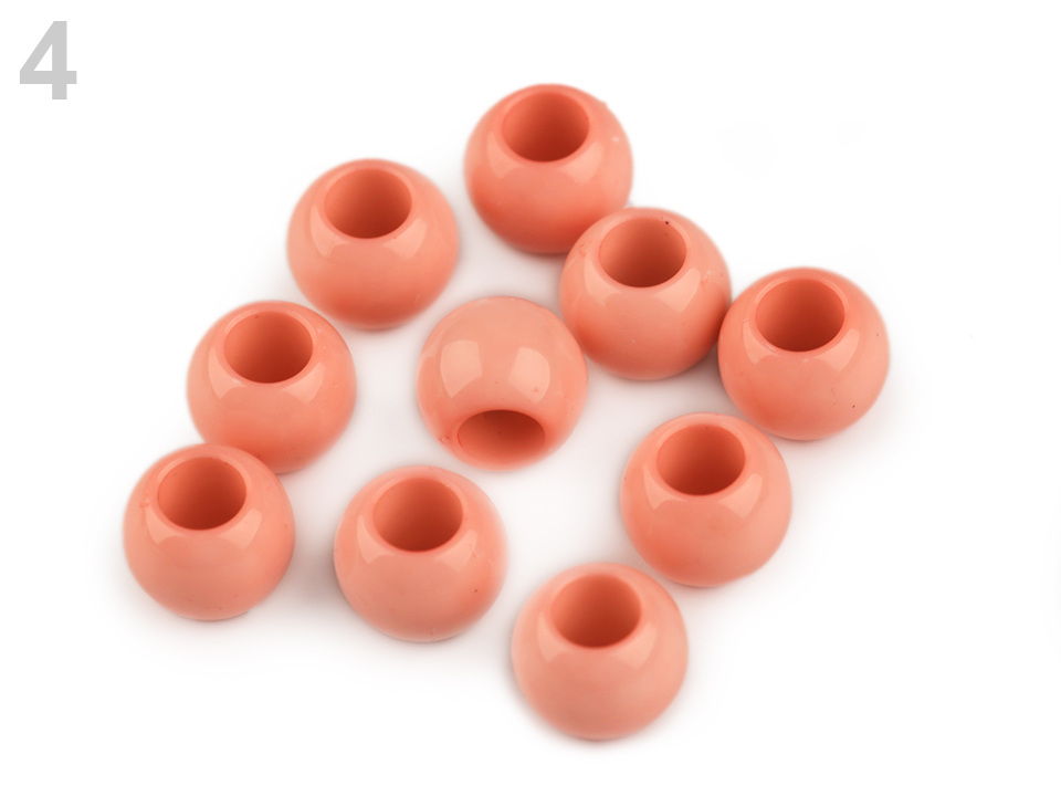 Plastové korálky s velkým průvlekem mají decentní lesk. Jsou povrchově barvené.
