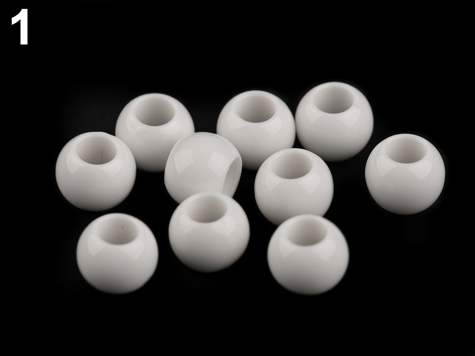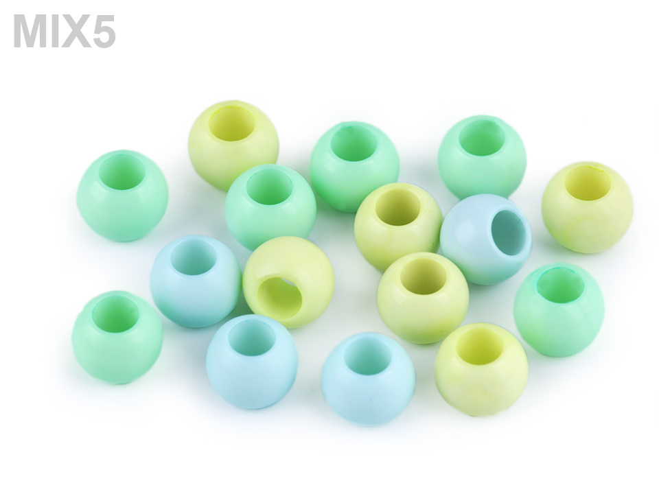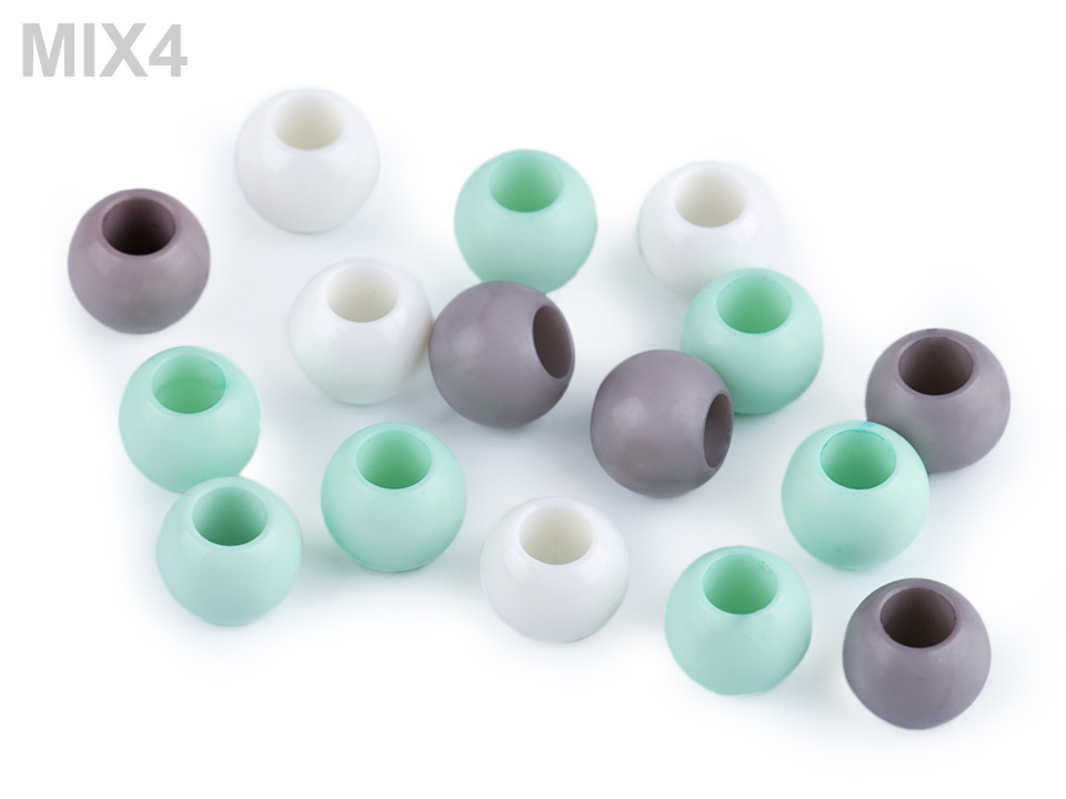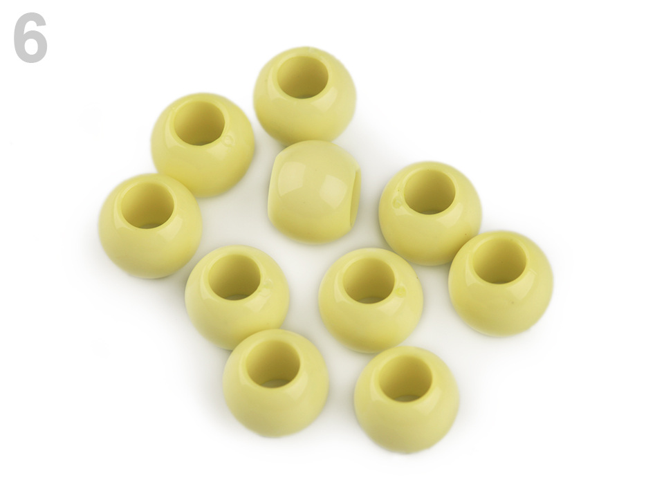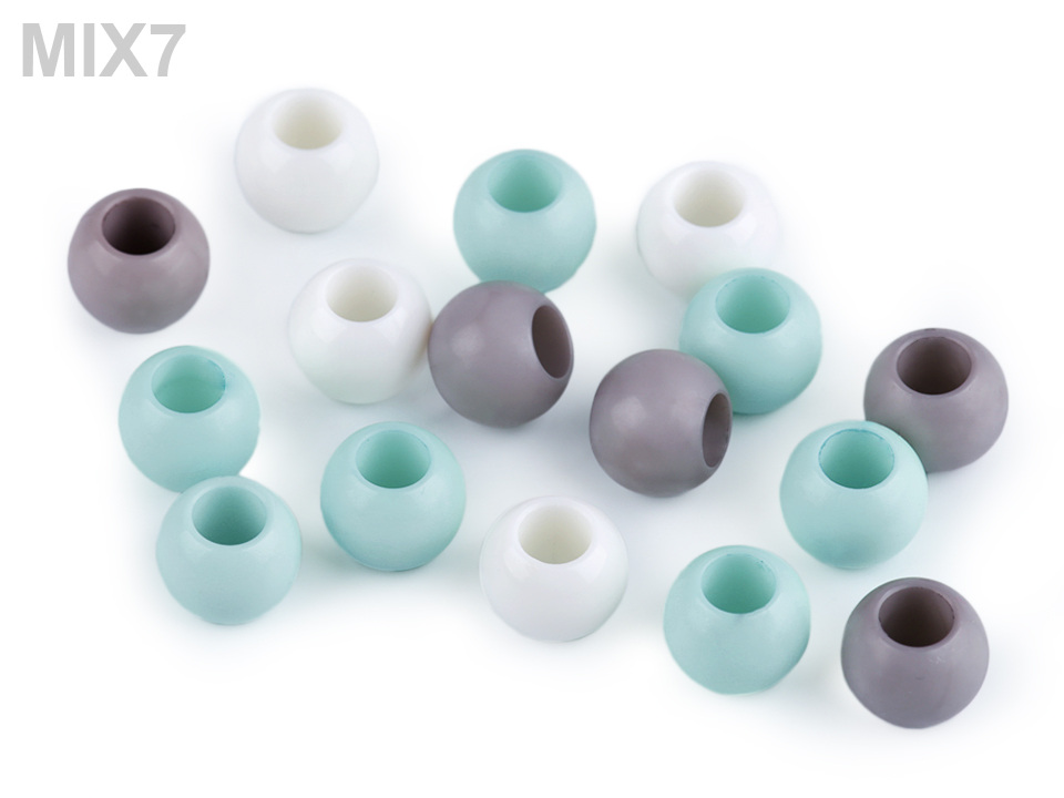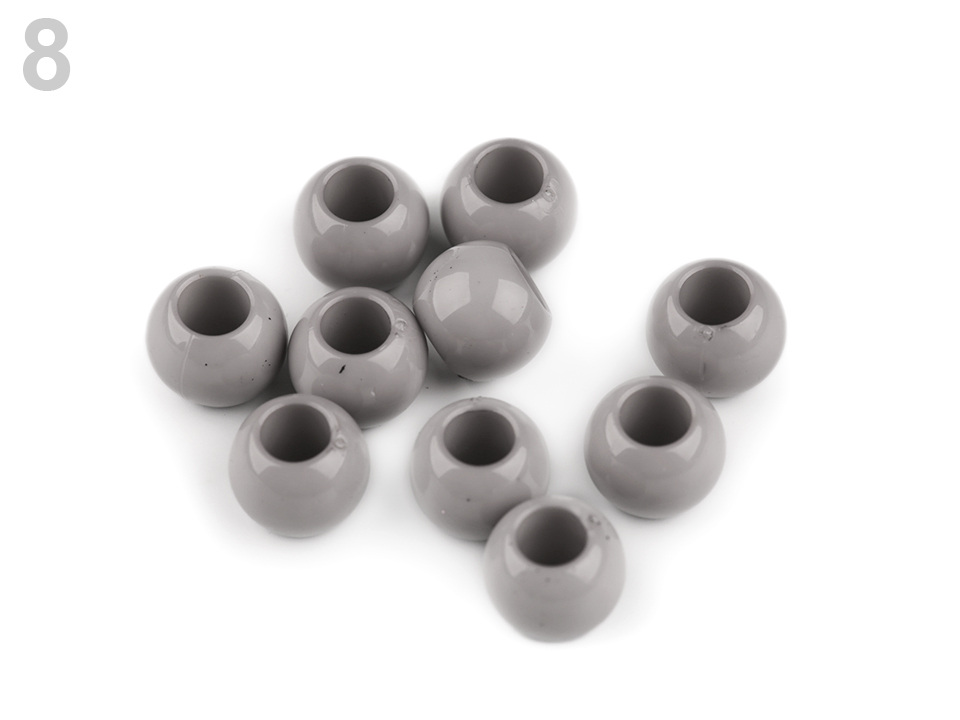 Plastové korálky s velkým průvlekem mají decentní lesk. Jsou povrchově barvené.