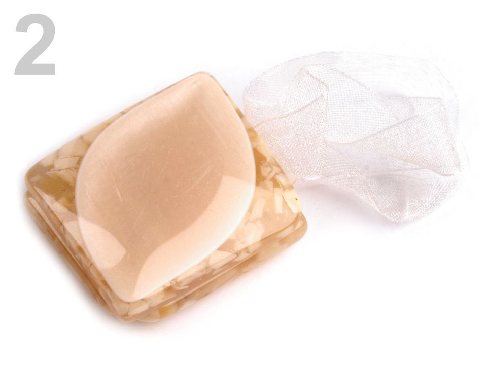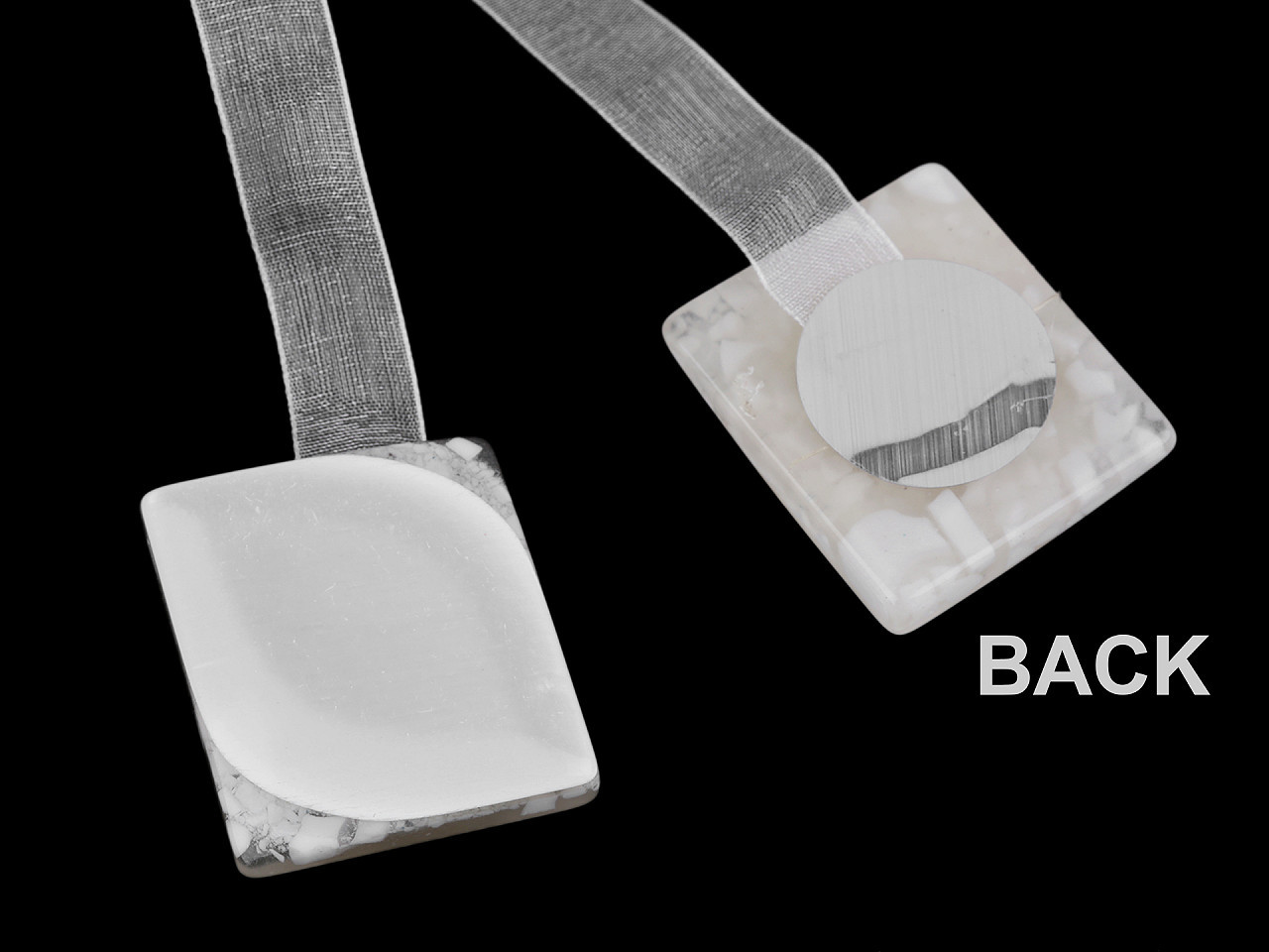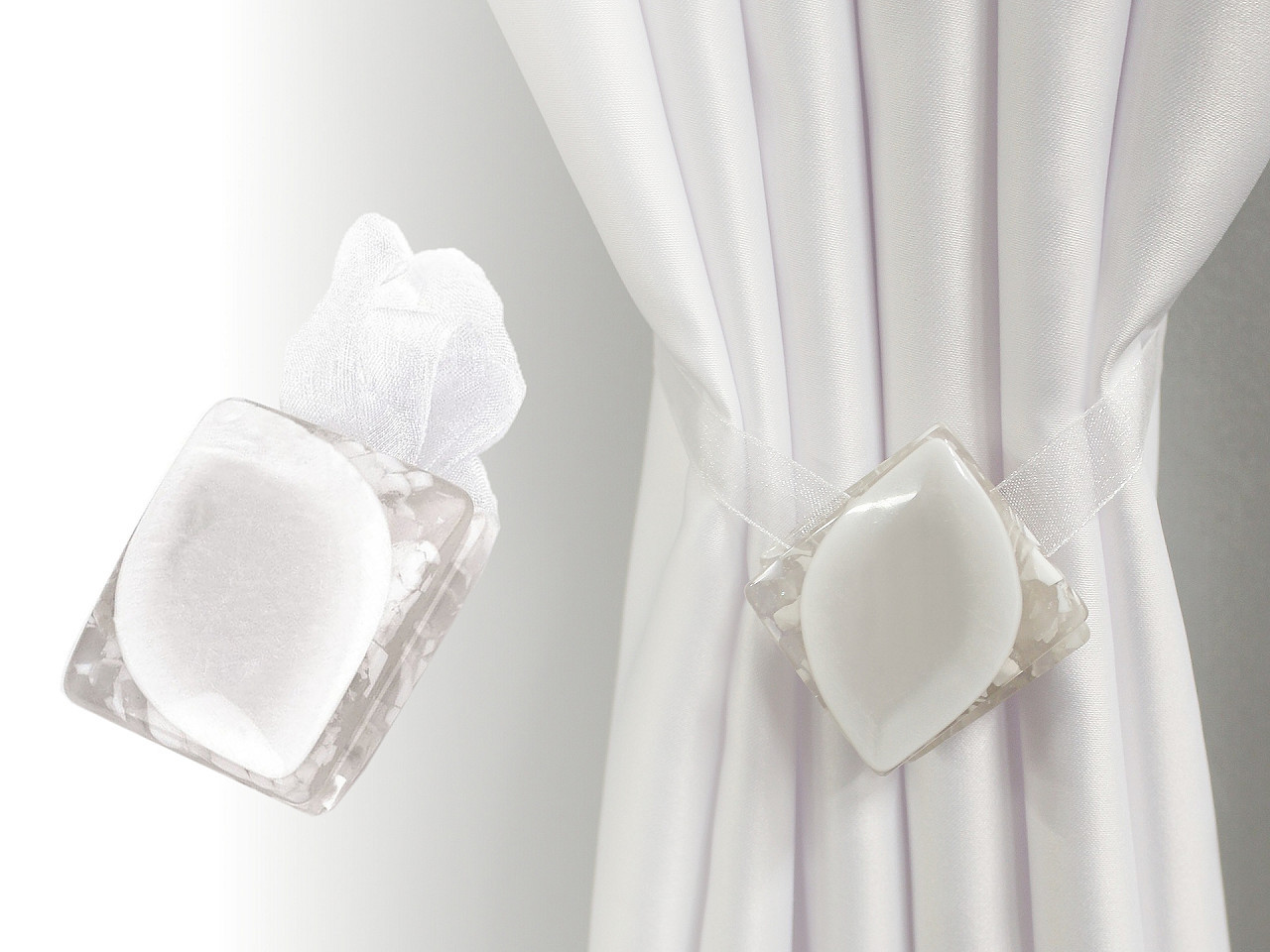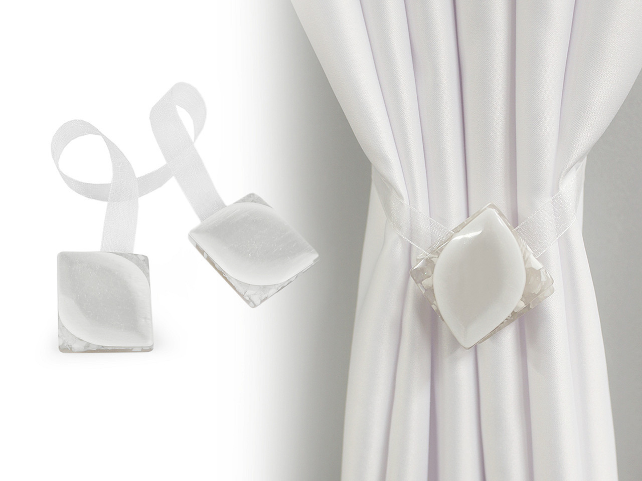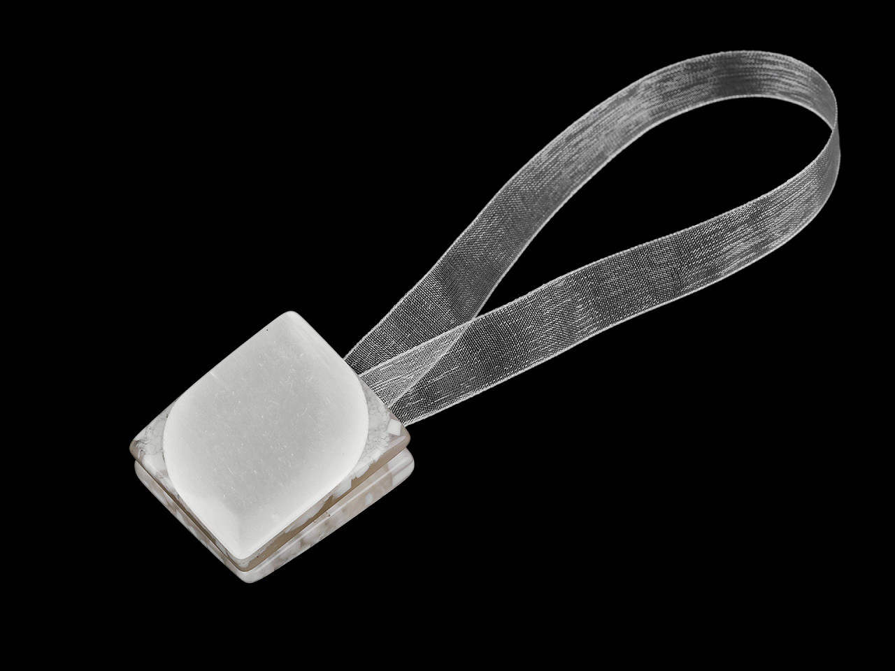 Ozdobná spona na závěsy s magnetem 3 x 4 cm a stuhou rozměr 1,2 x 32 cm (šíře x délka). Používá se na sepnutí závěsu. Stuha je lehce vyměnitelná za jiný druh.