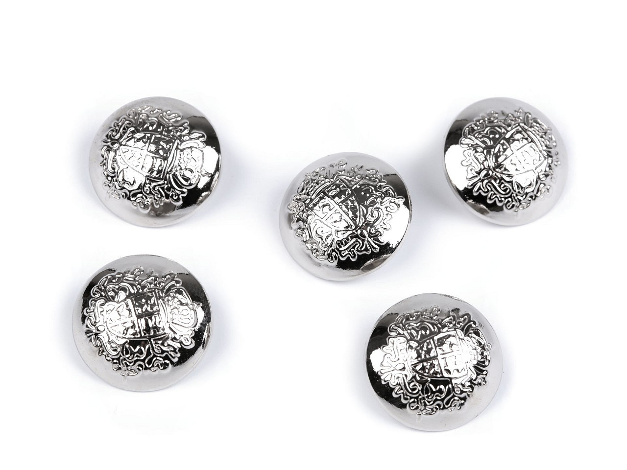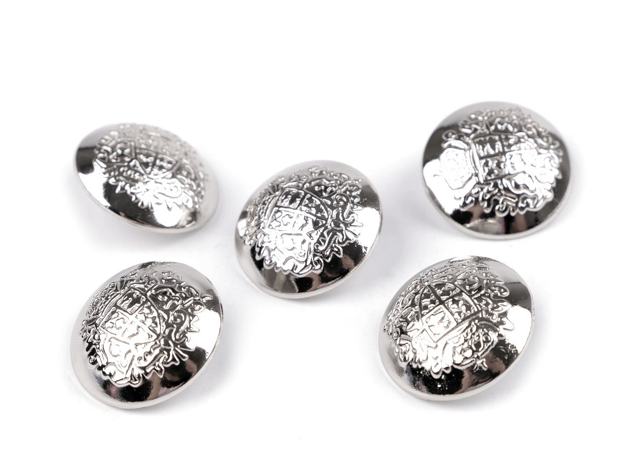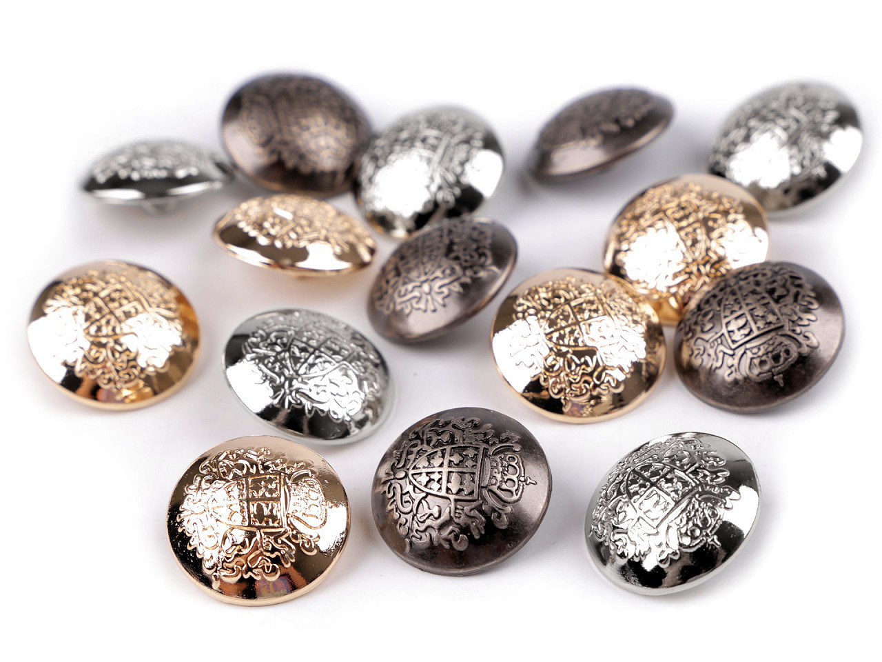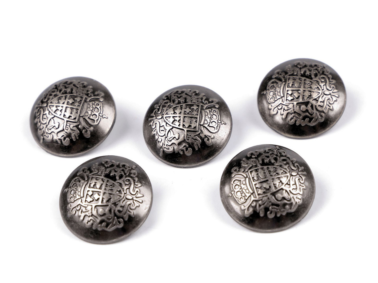 Kovové knoflíky se kromě praktického využití stanou elegantním doplňkem vašeho oděvu. Knoflíky se spodním přišíváním skvěle vyniknou na saku nebo kabátku vojenského stylu. Díky vyobrazenému erbu se také výborně hodí k přišití na uniformy, myslivecké oblečení či dobové kostýmy.