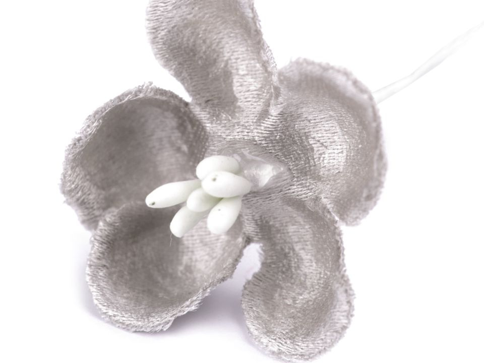 Saténový květ působí něžně a romanticky. Je na dlouhém ohebném drátku, který je omotaný floristickou páskou. Můžete ho libovolně tvarovat. Střed květu zdobí pestíky.