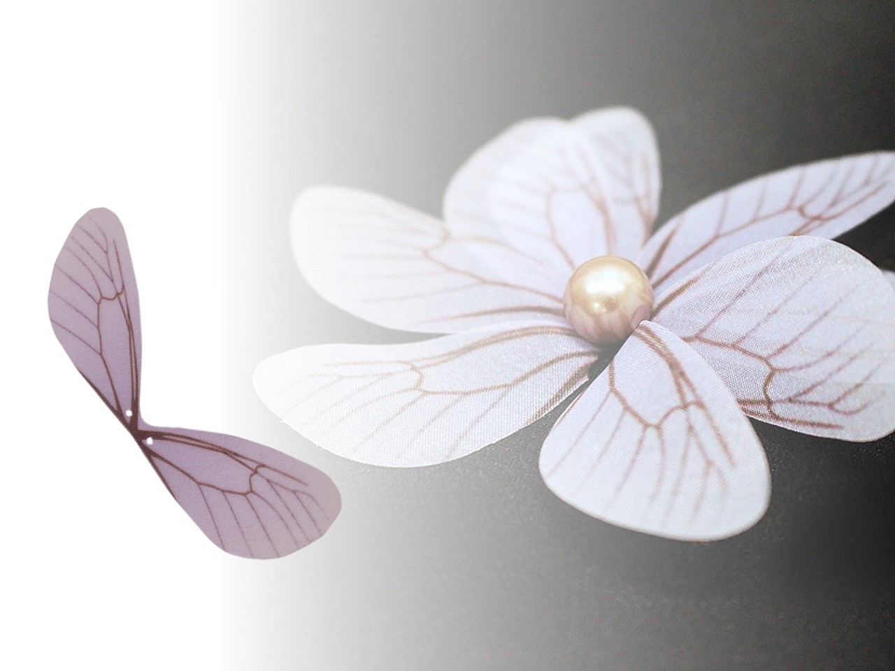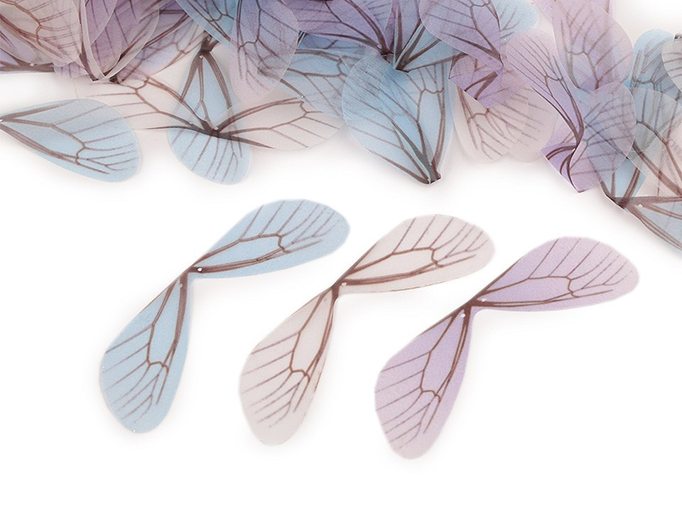 Jemná křídla vážky si oblíbí výrobci bižuterie, módních doplňků i floristé. Jsou lehce průsvitná, s drobným potiskem žilek. Okraj křídel se netřepí, uprostřed mají 2 dírky na přišití. Využijete je na výrobu šitých šperků, hodí se do květinových čelenek. Skvěle ozdobí letní obuv, tašky i klobouky. Mohou být zajímavou ozdobou fotorámečků, deníků, přání nebo zabaleného dárku. Své využití najdou i v květinových vazbách, dekoračních věncích apod.