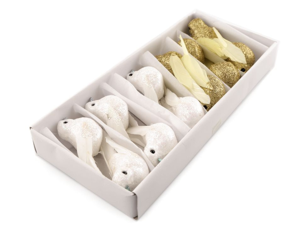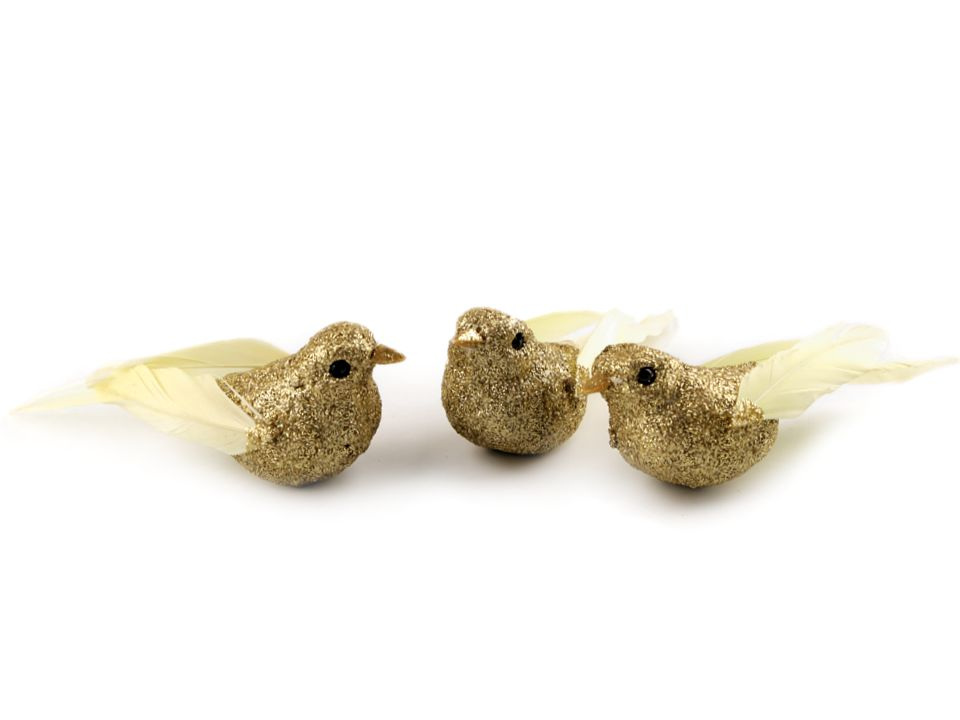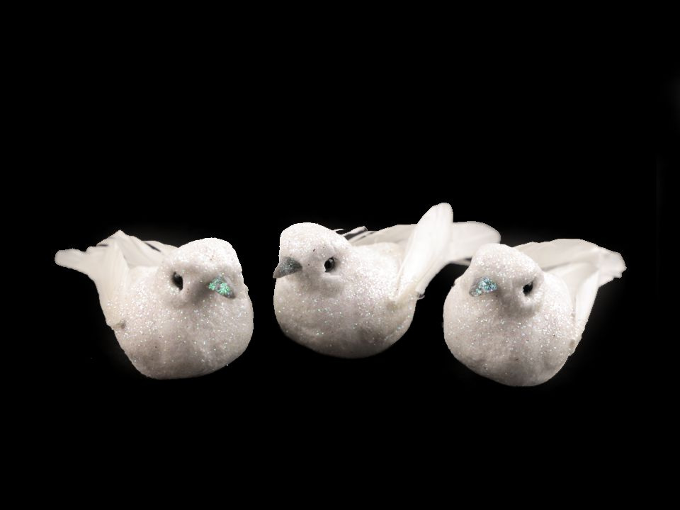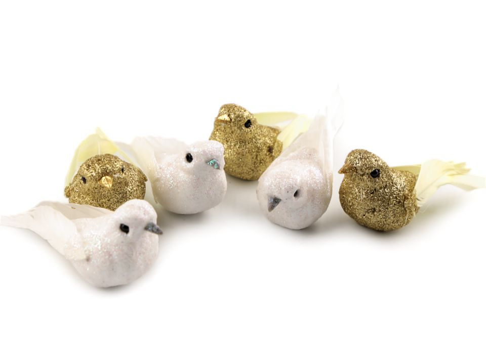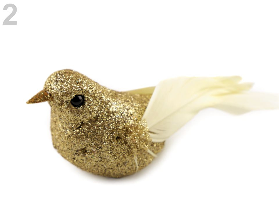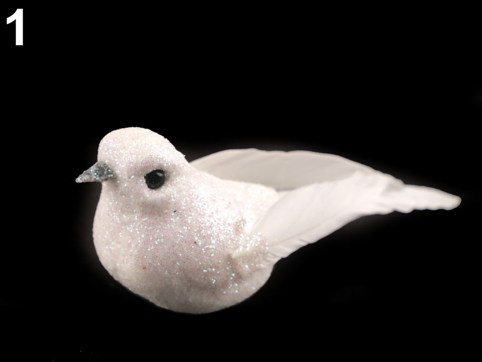 Dekorační ptáček vás okouzlí svým třpytivým vzhledem. Křídla a ocásek má z peří. Ptáček vynikne na vánočních i svatebních dekoracích. Můžete ho nalepit na věnce, krabičky, dárky apod.