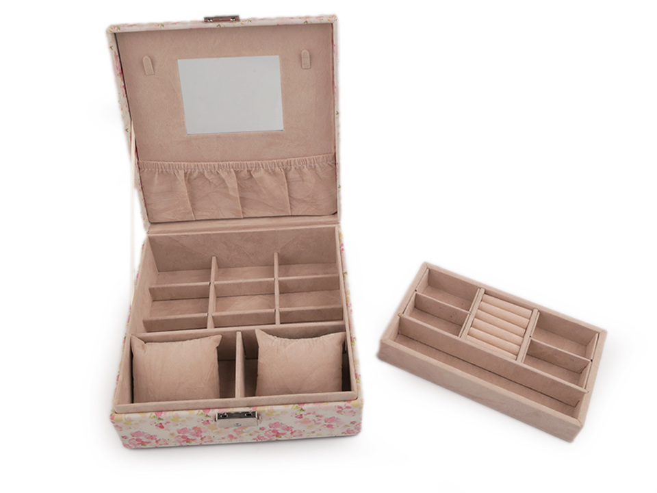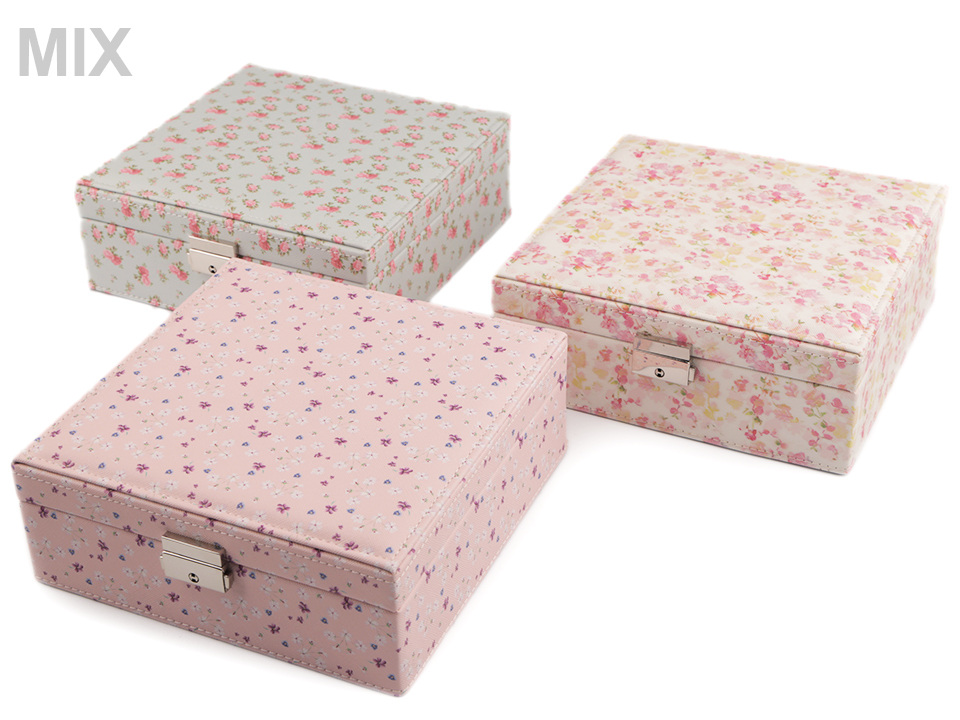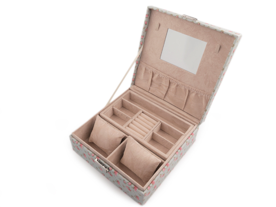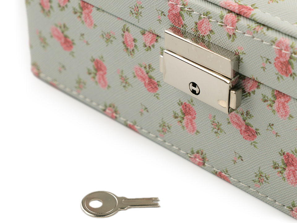Dvoupatrová šperkovnice se zrcátkem je vyrobená z kvalitní eko kůže. Díky potisku s drobnými květy vypadá romanticky. Má kovové, mechanické zapínání. Spolehlivě ochrání šperky před světlem nebo vlhkostí.