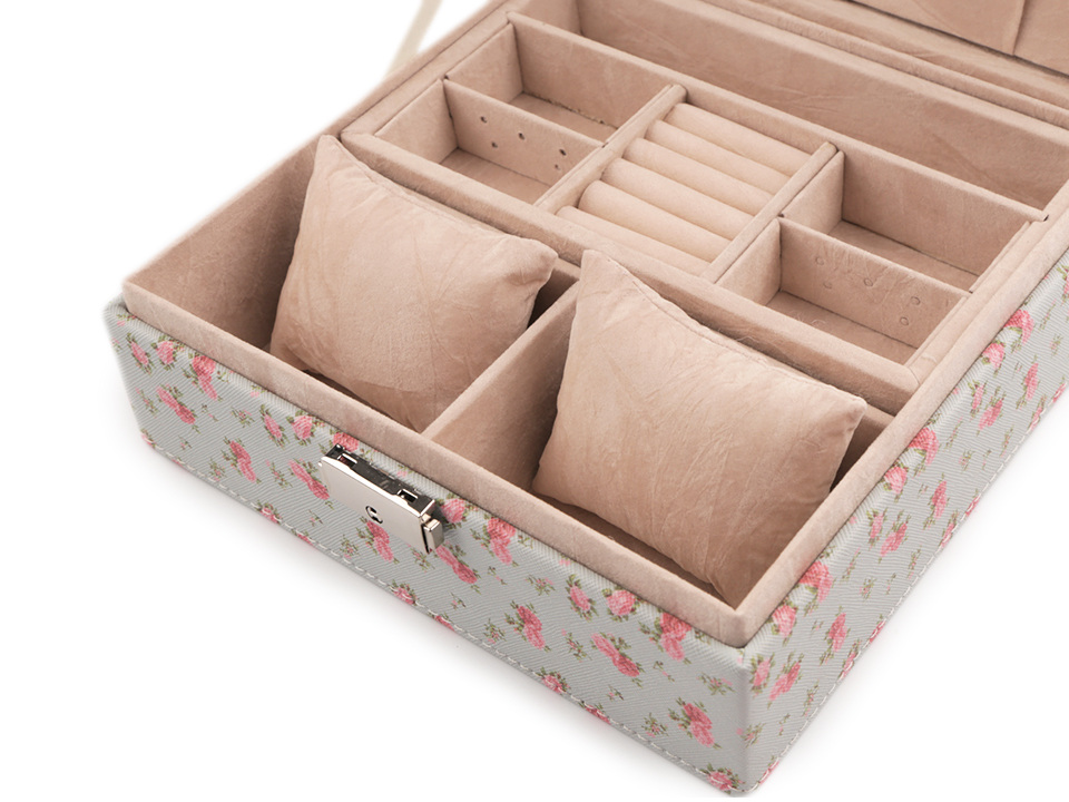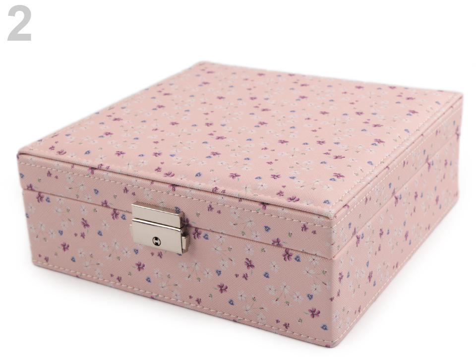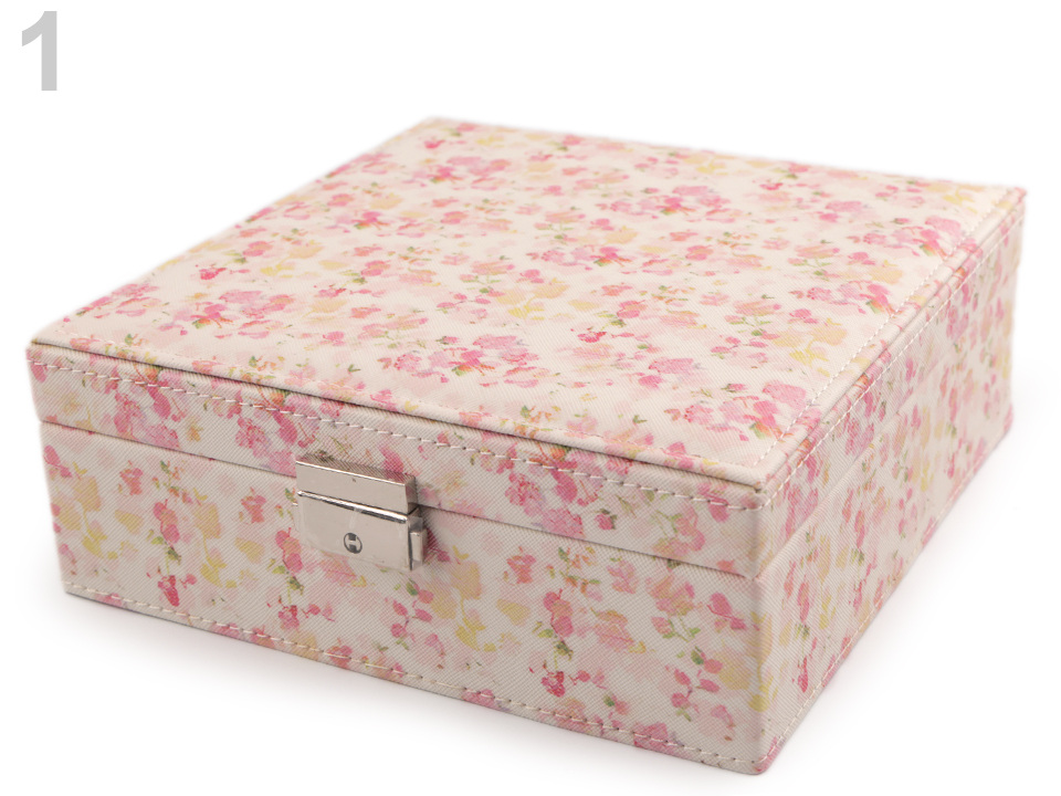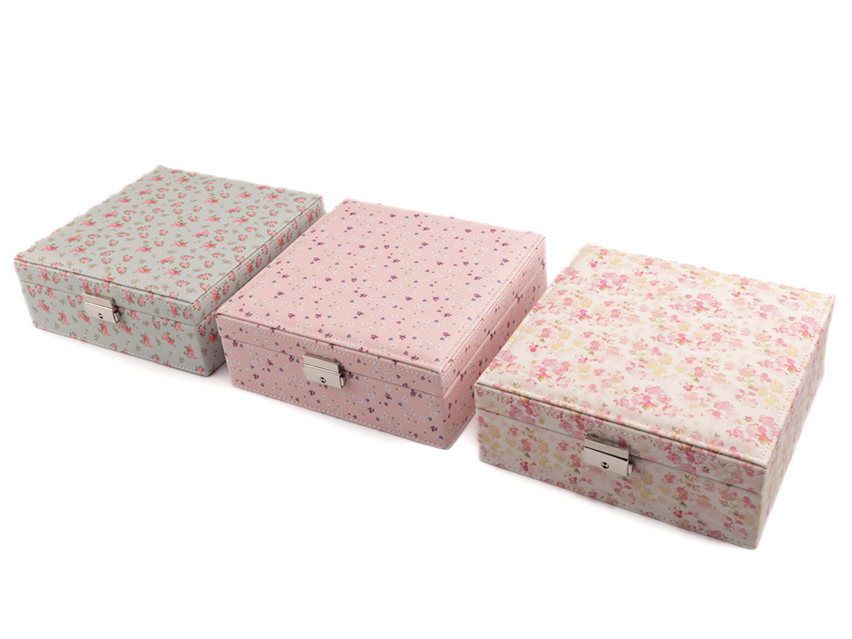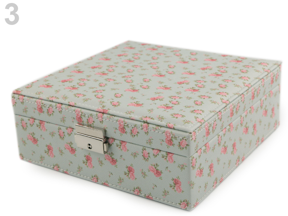 Dvoupatrová šperkovnice se zrcátkem je vyrobená z kvalitní eko kůže. Díky potisku s drobnými květy vypadá romanticky. Má kovové, mechanické zapínání. Spolehlivě ochrání šperky před světlem nebo vlhkostí.