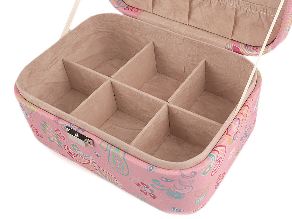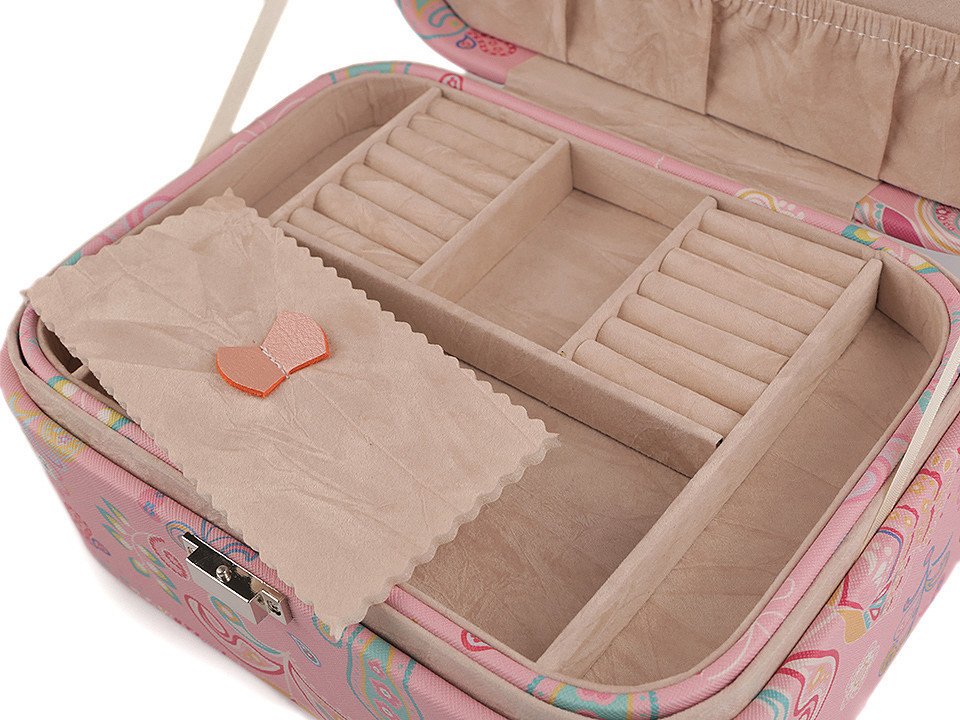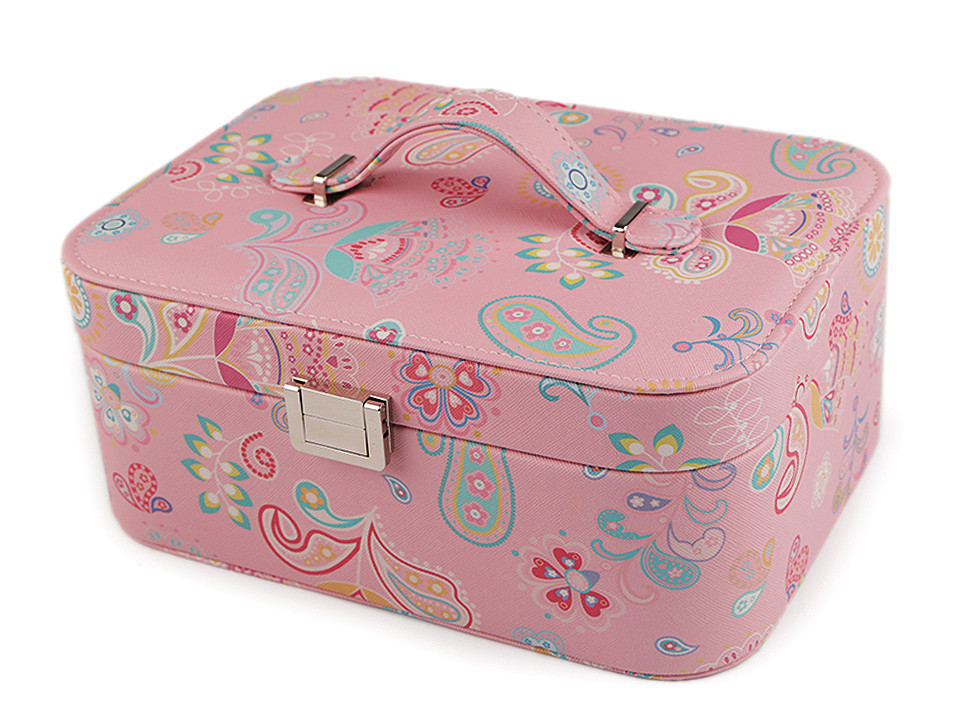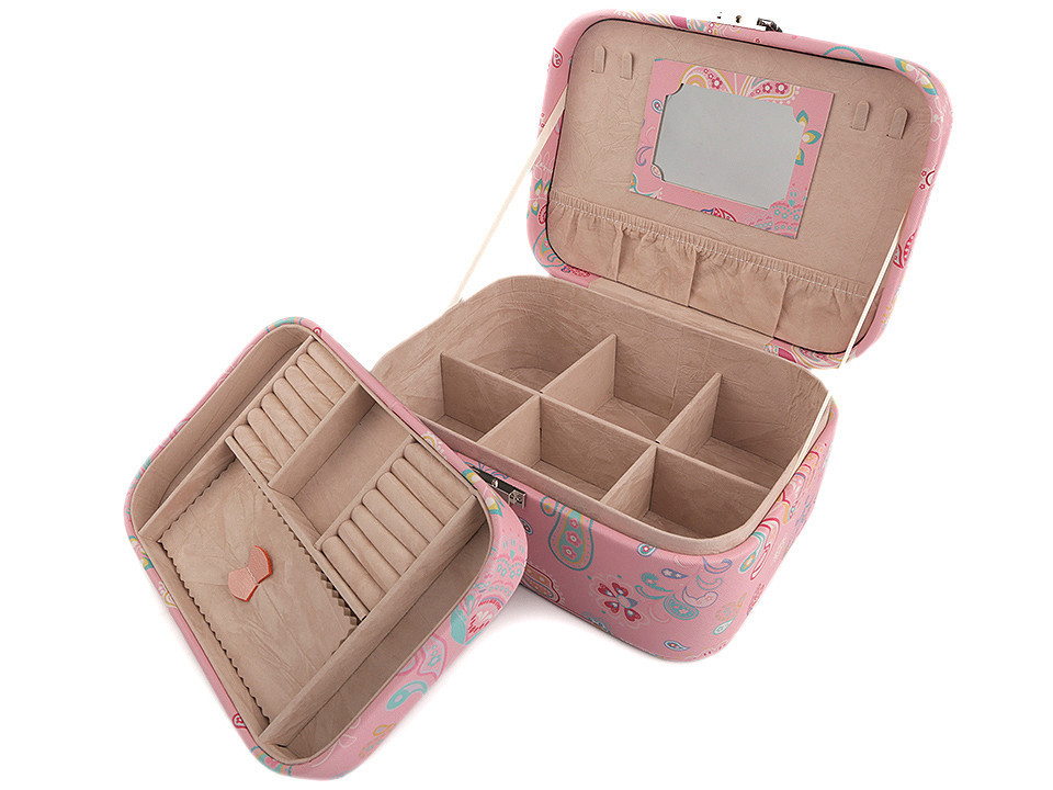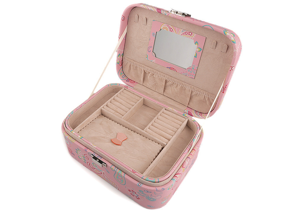 Dvoupatrová šperkovnice se zrcátkem je vyrobená z kvalitní eko kůže. Barevný potisk zobrazuje paisley ornamenty a květy. Má kovové zapínání. Spolehlivě ochrání šperky před nepříznivými vlivy okolí jako je světlo nebo vlhkost.