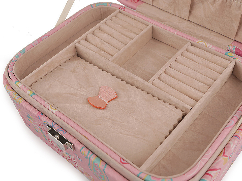 V horním patře jsou 4 přihrádky, 2 oddíly na prsteny, zrcátko a kapsa. Dolní patro je rozdělené na 6 přihrádek. Šperkovnice má velice kvalitní a precizní provedení.