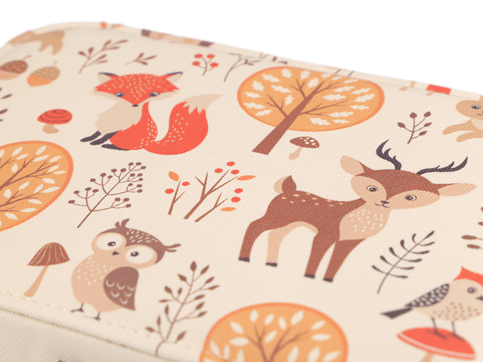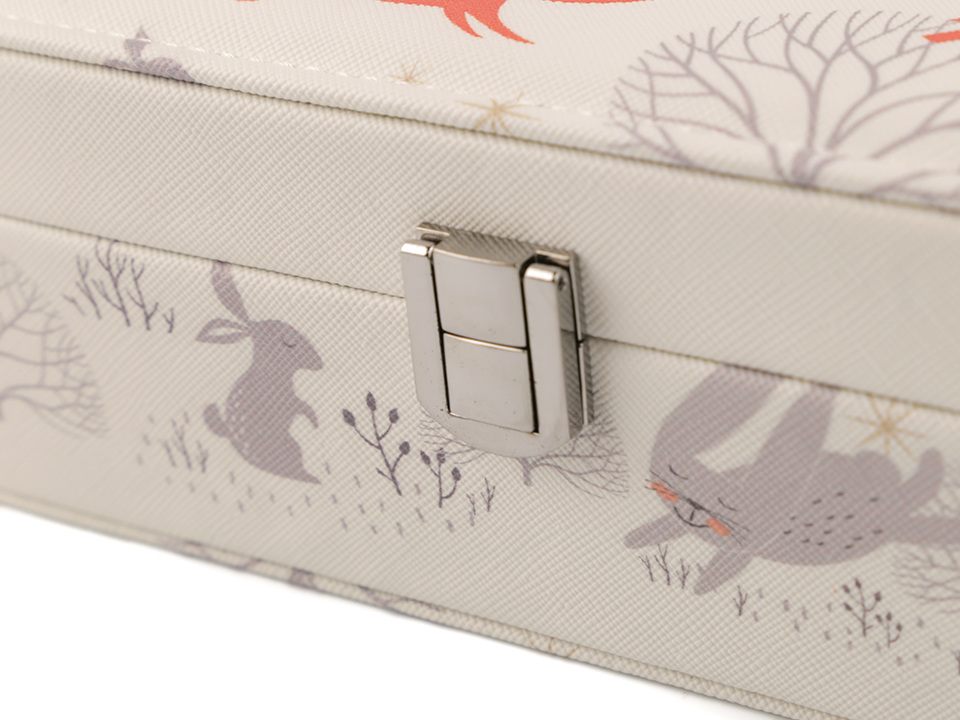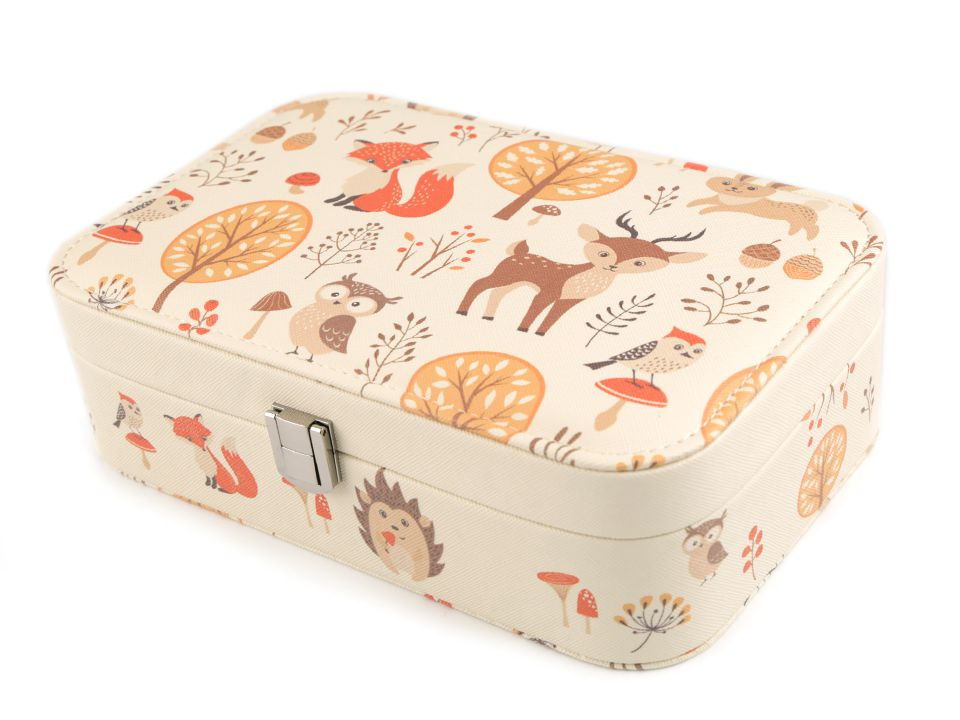Šperkovnice se zrcátkem má povrch z eko kůže. Potisk stylizovaných lesních zvířat je velice milý, nadchne každou ženu. Šperkovnice má kovové zapínání. Ochrání vaše šperky před nepříznivými vlivy okolí, jako je světlo nebo vlhkost. Uvnitř šperkovnice je 5 přihrádek, polštářek na brože, hodinky či náramky, oddíl na prsteny, kapsa a zrcátko. Šperkovnice má velice kvalitní a precizní provedení.