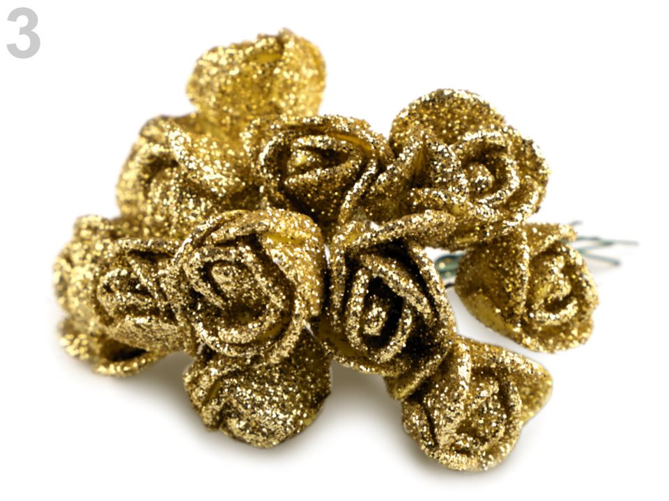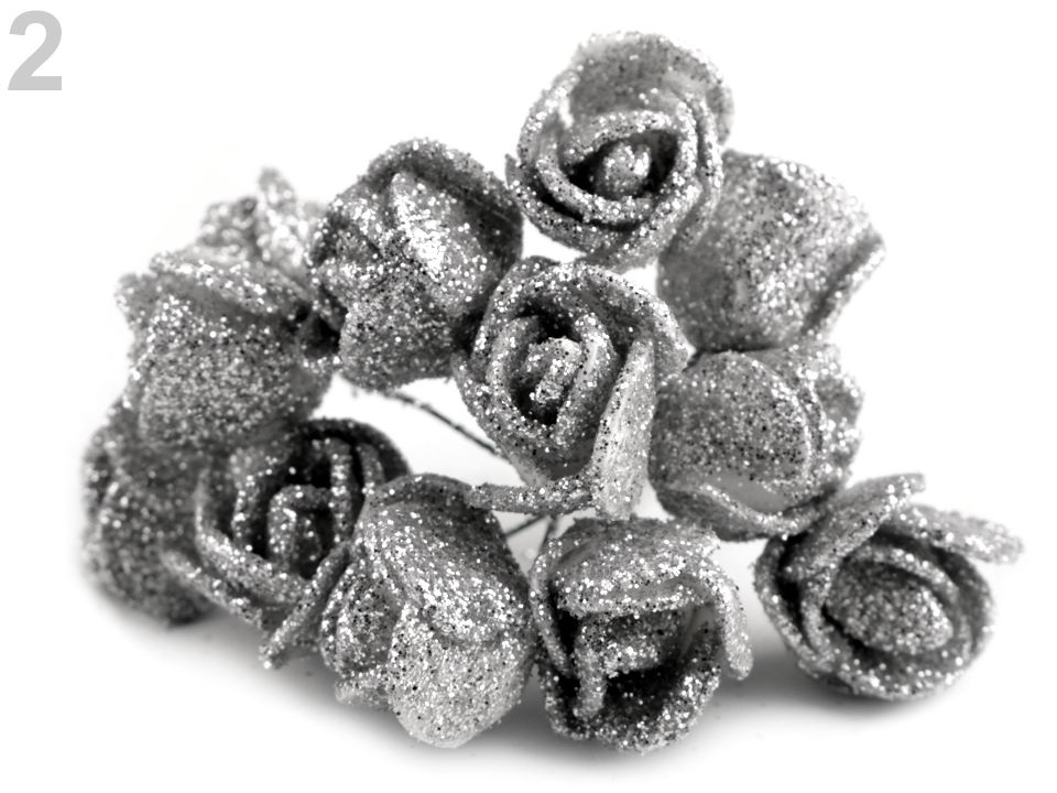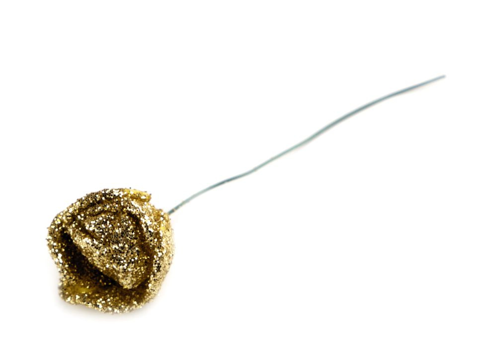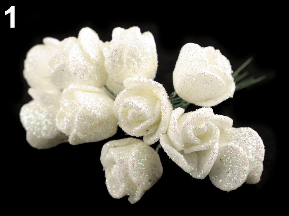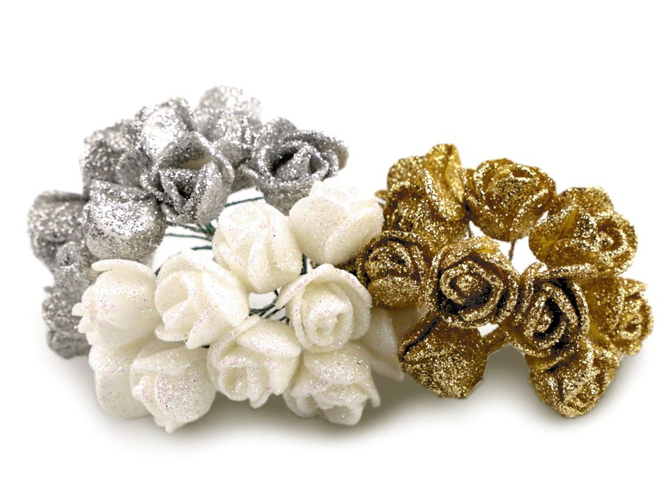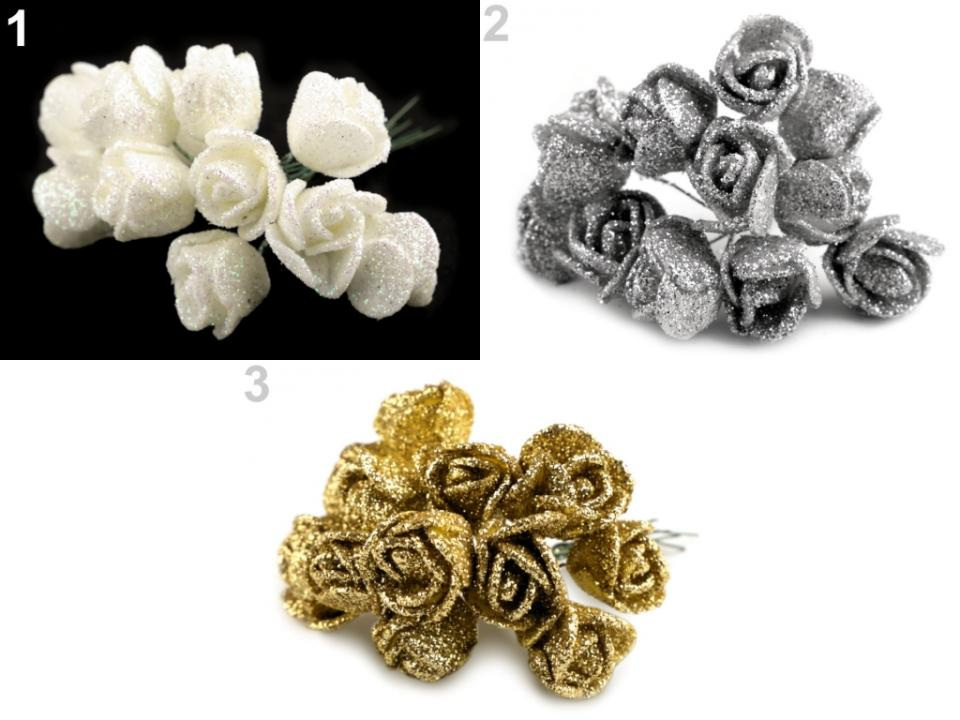 Třpytivé dekorační růžičky jsou skvělou volbou při výrobě vánočního či svatebního aranžmá. Povrch jednotlivých růžiček je zdoben oslnivými glitry, které jim dodávají nádech luxusu a elegance. Květy jsou připevněny k drátku, kterým lze lehce manipulovat.