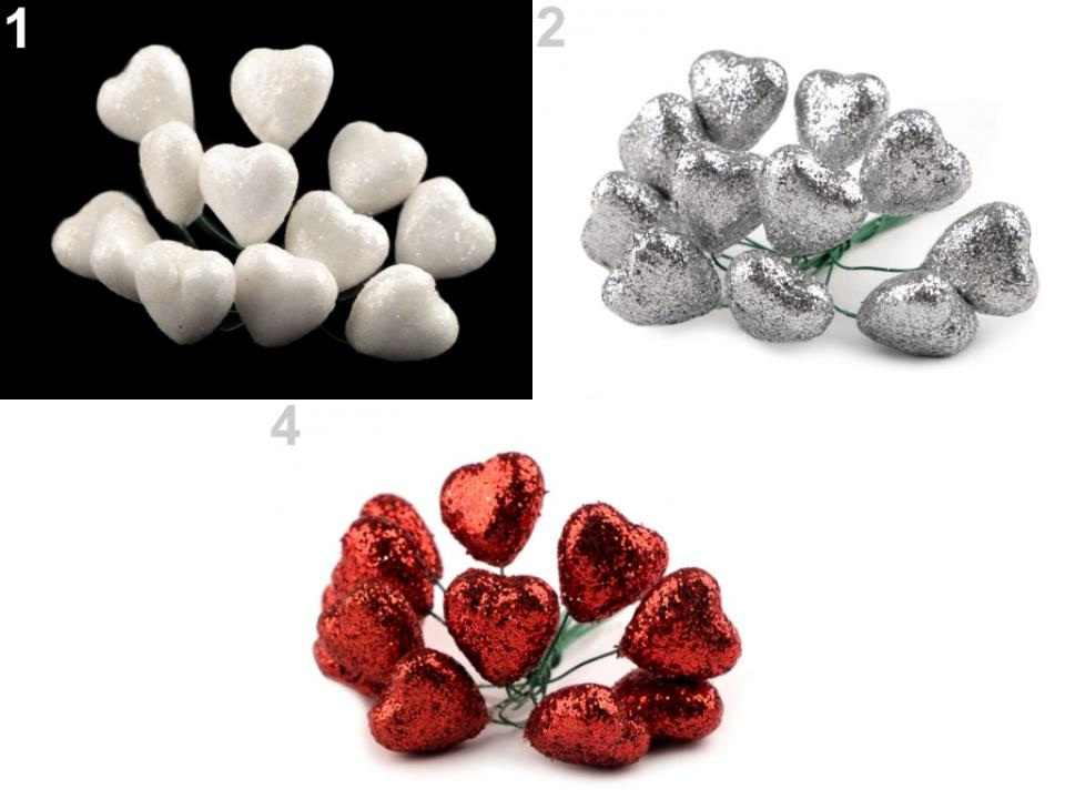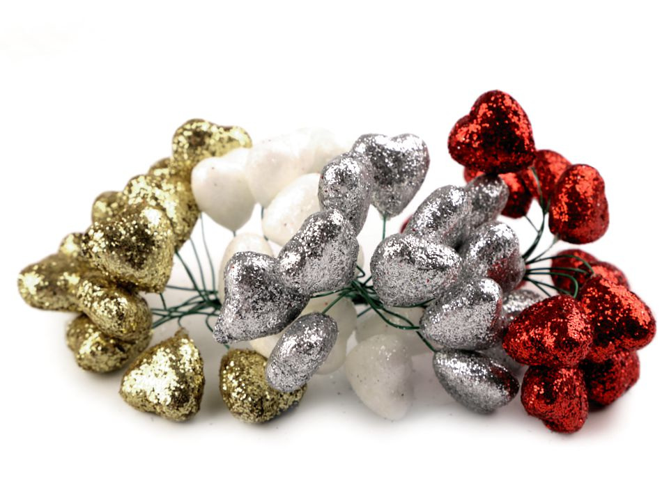 Použití: Třpytivá srdíčka můžete naaranžovat na vánoční věnce či vazby. Jsou vhodné i na zapichování do polystyrenových polotovarů.