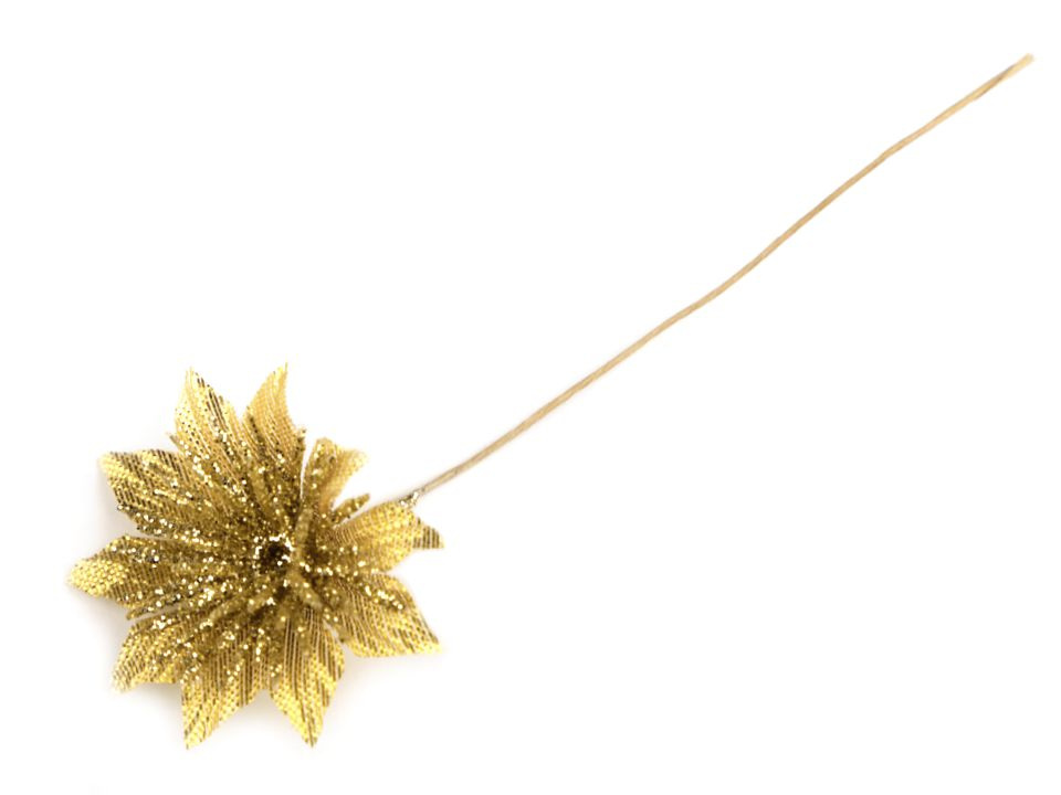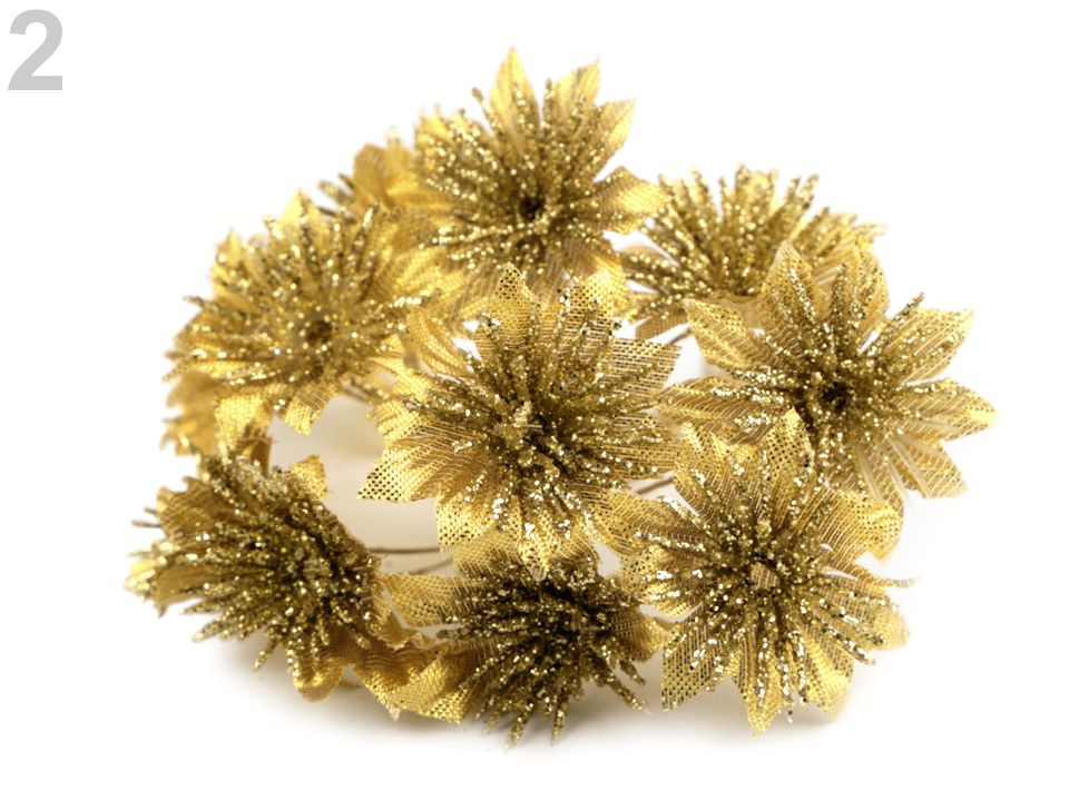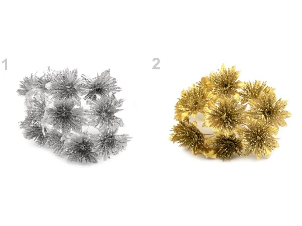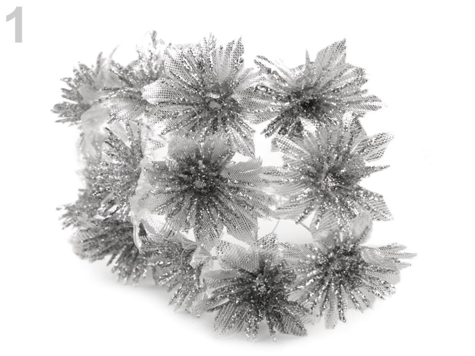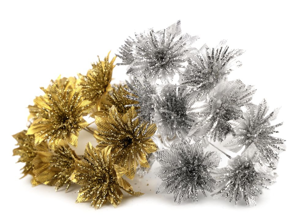 Motiv vánoční hvězdy je typickým prvkem vánočního aranžmá. Jednotlivé květy vás oslní svým třpytem díky glitrům a lurexovým vláknům, kterými jsou prošity okvětní lístky. Květy jsou připevněny k ohebnému drátku, kterým lze lehce manipulovat.