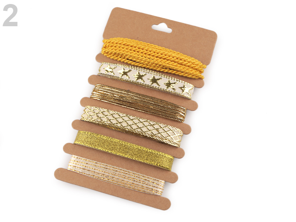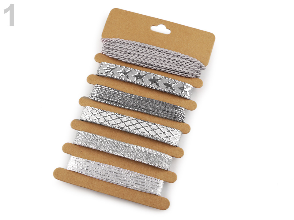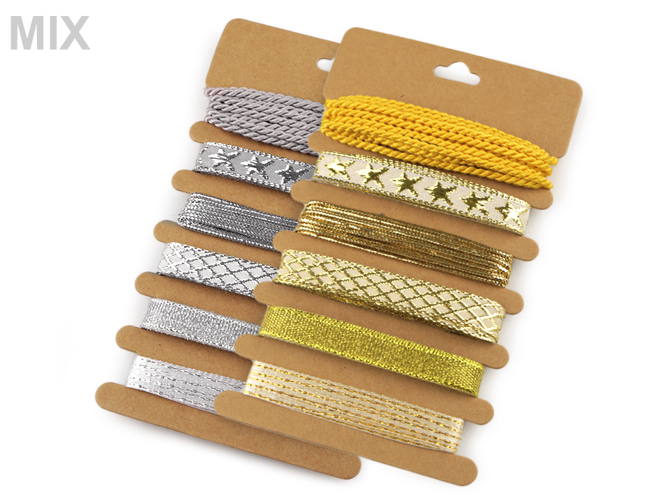 Sada namixovaných vánočních stuh a provázků vám umožní kreativně zabalit dárky. Najdete zde stuhy s různými motivy, ozdobené třpytivým lurexem. Jsou namotané na papírové kartě.