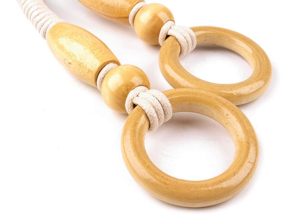Ucho je textilní, na obou koncích opatřené dřevěnými kroužky. Ucho měří 1x55cm, kroužek na koncích má vnější Ø50mm, vnitřní Ø30mm. Maximální nosnost je 4-5kg. Ucha jsou použitým materiálem i vzhledem určena pro lehké textilní tašky.