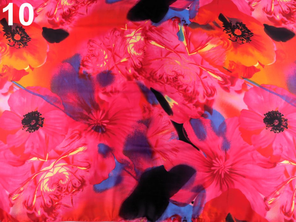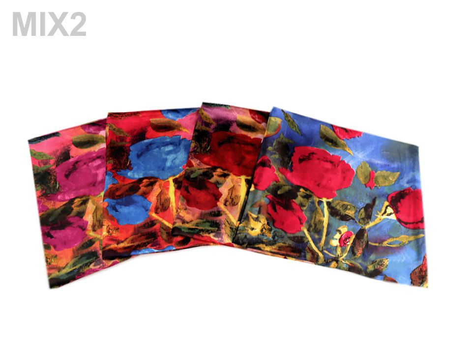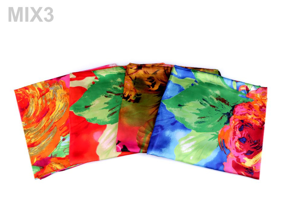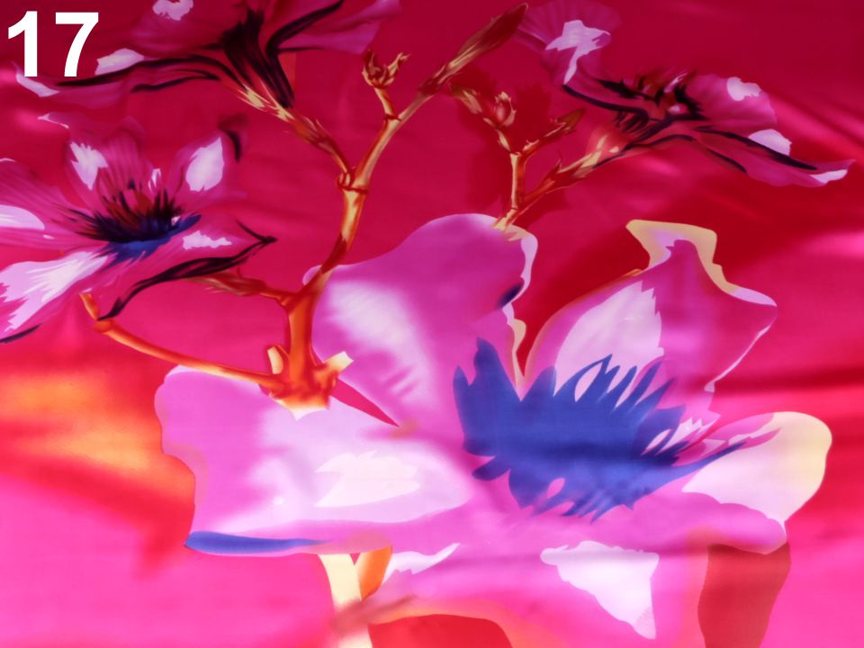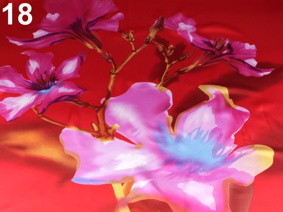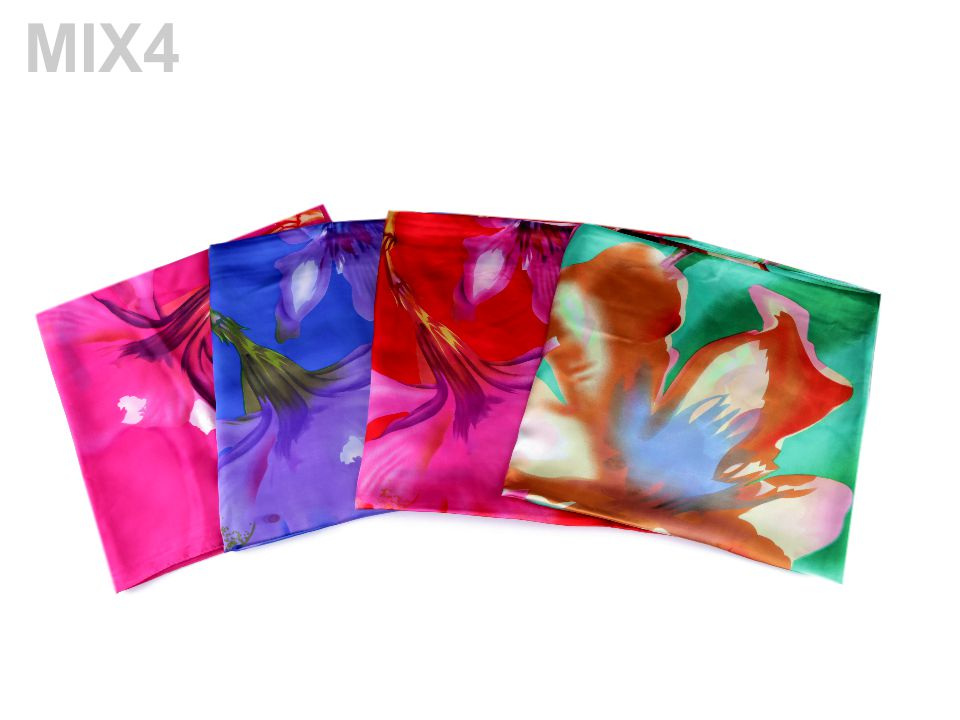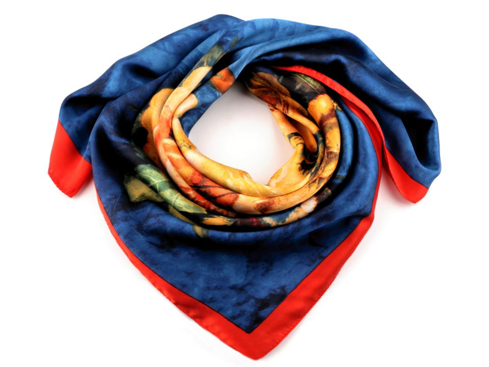 Elegantní saténový šátek s motivem velkých barevných květů. Příjemný materiál s jemným leskem vás bude doslova hýčkat. Šátek potěší všechny ženy, které mají rády estetické doplňky. Hodí se do společnosti i do práce ke kostýmku, kabátu, halence, svetříku apod. Čtvercový tvar, můžete variabilně upravit kolem krku. Šátek je dostatečně velký, aby posloužil i jako pareo na pláž.