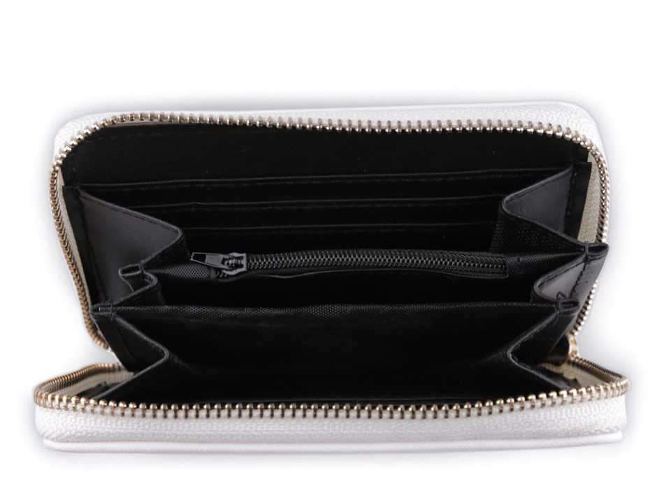 Peněženka je uzavíratelná na zip, uvnitř se nachází tři větší přihrádky na bankovky a jedna uzavíratelná kapsa na zip, do které uschováte mince a drobnosti. Po obou stranách peněženky se nachází celkem šest přihrádek na doklady a karty.