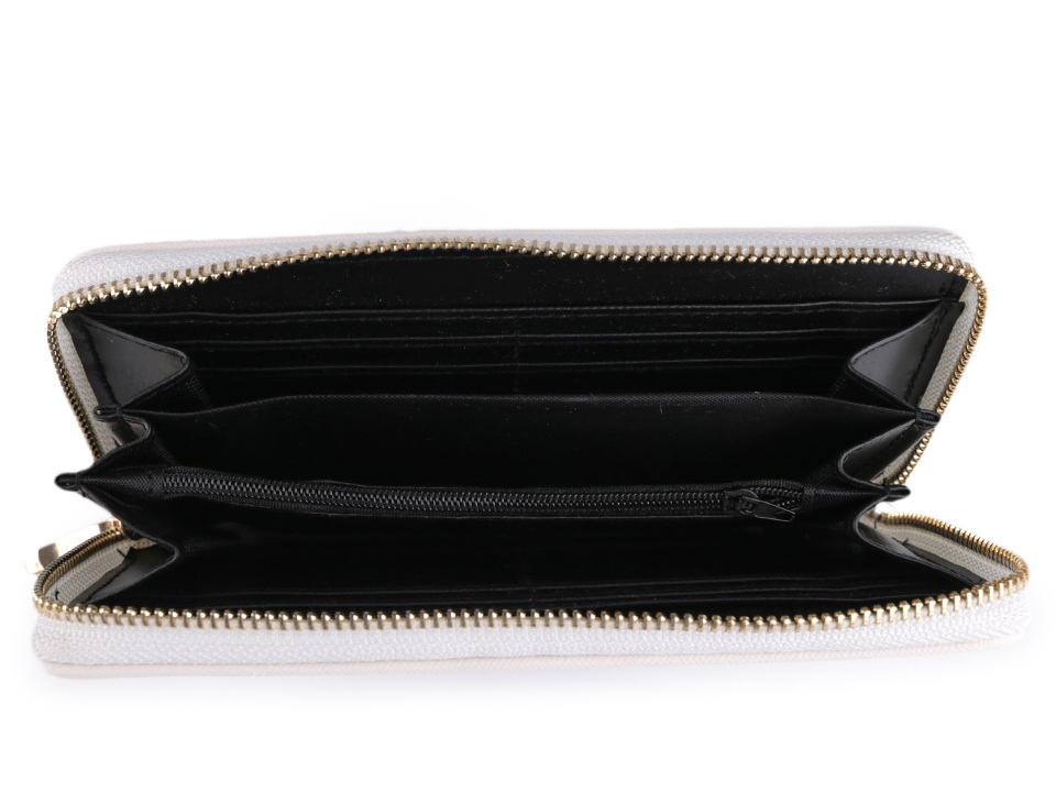 Peněženka obsahuje jednu hlavní kapsu na kovový zip, která je dále členěna do tří velkých přihrádek na papírové bankovky nebo mobilní telefon a jedné uzavíratelné kapsy na zip, vhodné k ukládání mincí a různých drobností. Po vnitřních stranách peněženky je rozmístěno celkem osm přihrádek na karty a dvě delší na doklady, účtenky apod.