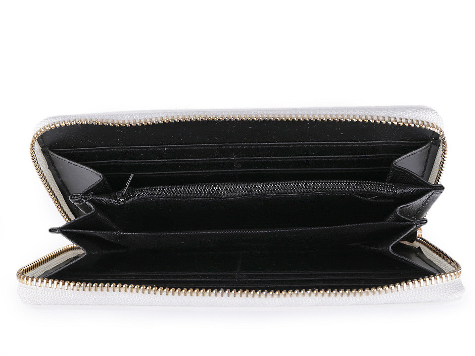 Peněženka je uzavíratelná na zip, uvnitř se nachází tři velké přihrádky na bankovky nebo mobilní telefon, a jedna uzavíratelná na zip, do které schováte mince a různé drobnosti. Po stranách peněženky se nachází dvě podlouhlé kapsy a osm menších přihrádek na doklady a karty.