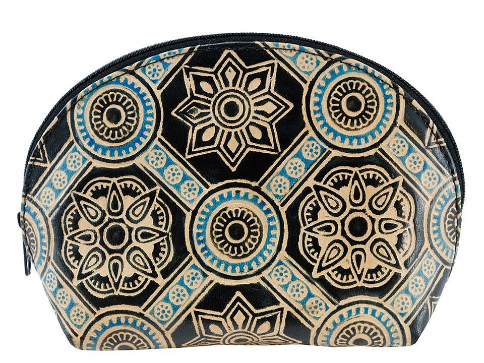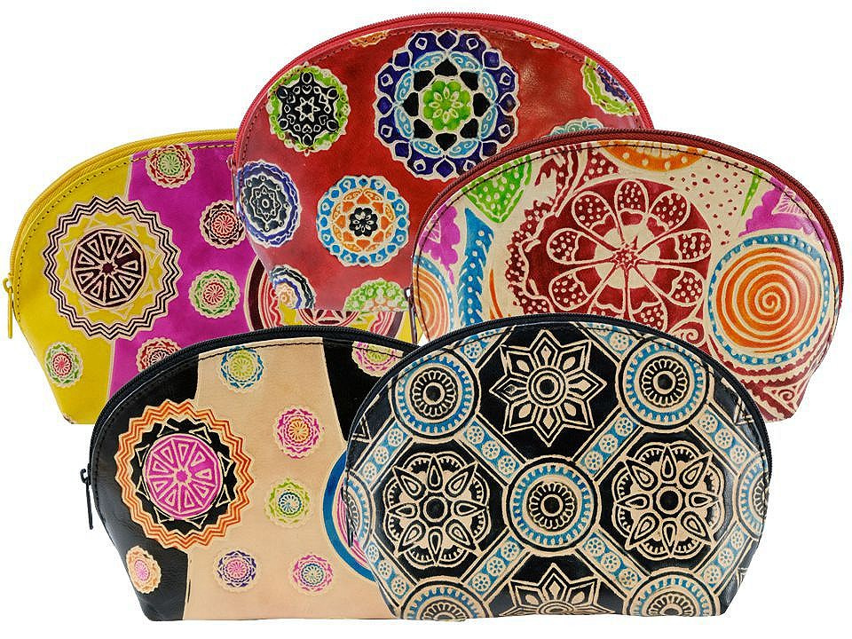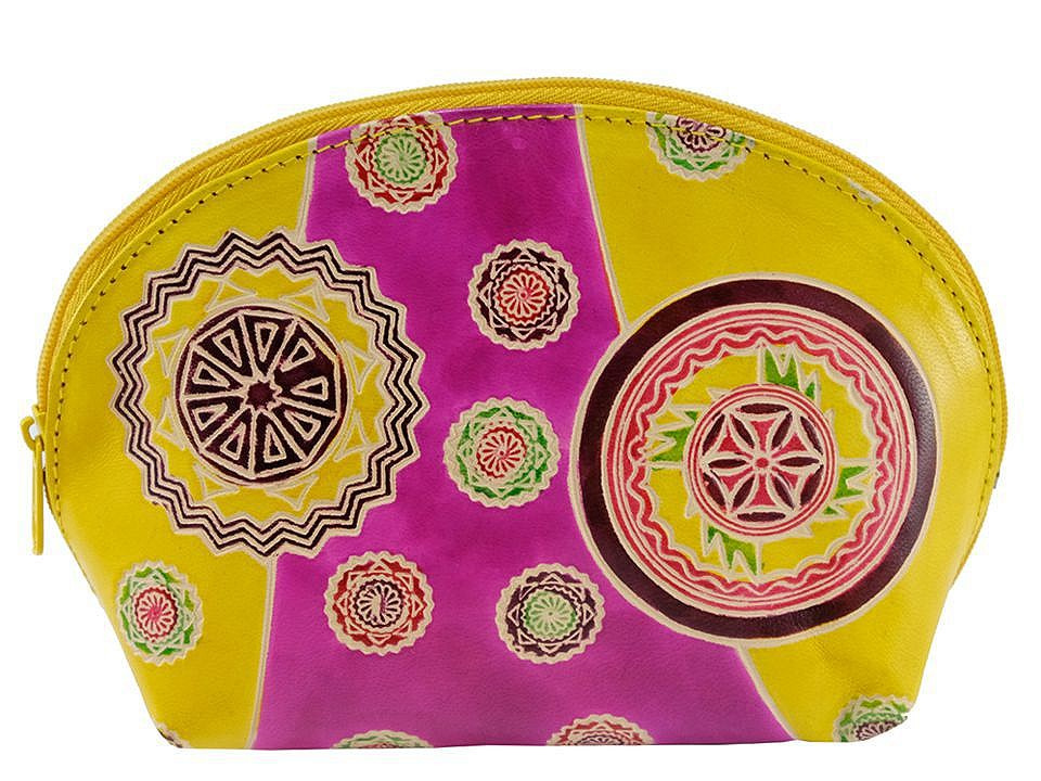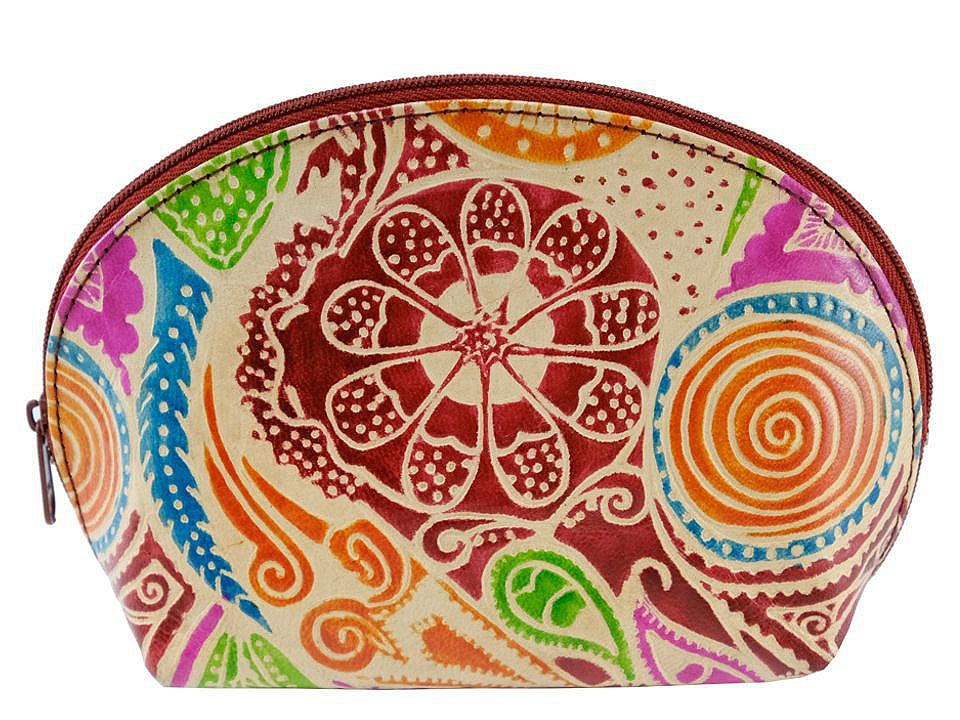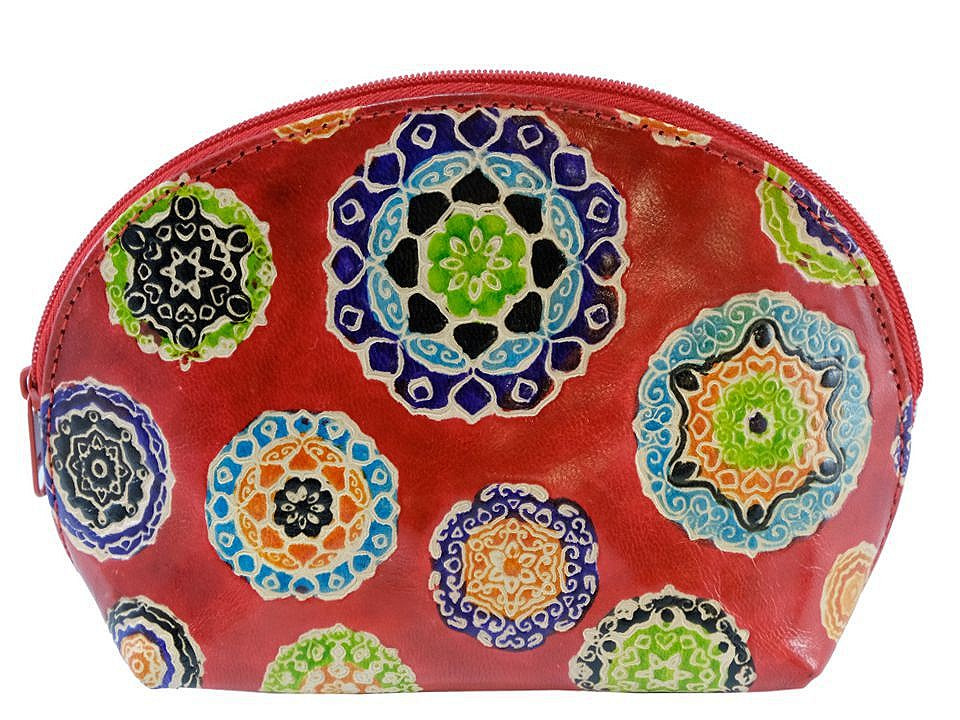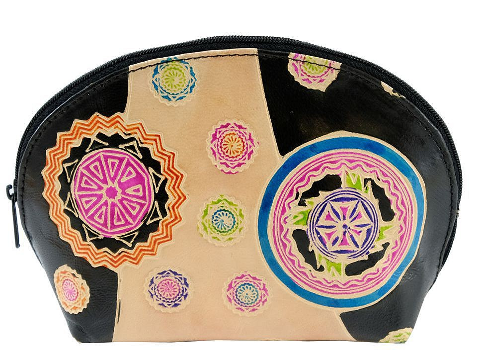Kožená kosmetická taška je zdobená pestrobarevnými etno vzory, které na sebe upoutají veškerou pozornost. Taštička je prostorná, vejde se do ní kosmetika, manikúra i malé zrcátko. Je také vhodná jako pouzdro na mobil, psací pomůcky apod. Taška je díky koženému materiálu nenáročná na údržbu. Je ručně malovaná, každý kus se od sebe mírně odlišuje a zaručuje tak originalitu a jedinečnost. Zapíná se na zip.