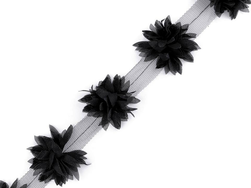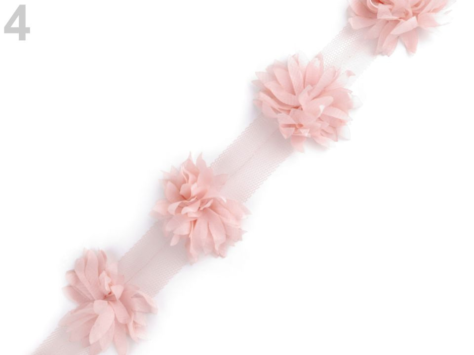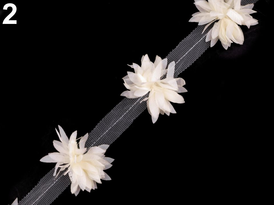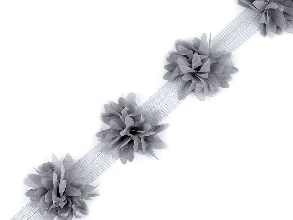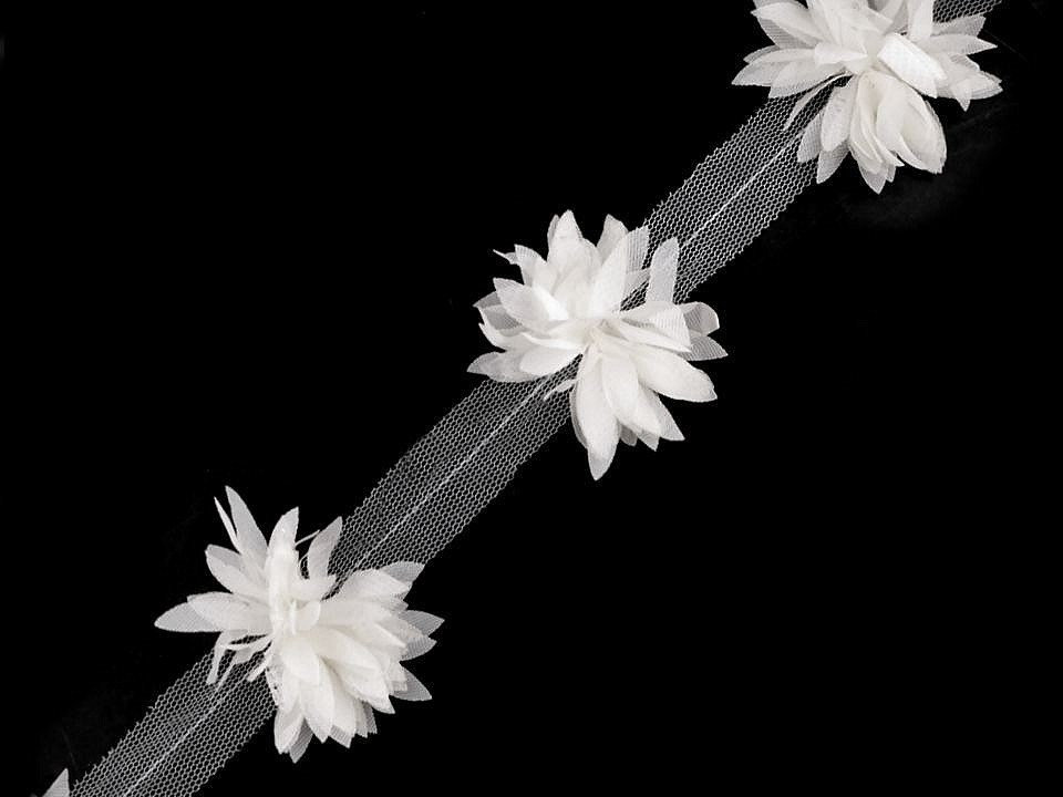 Prýmek na tylu je zdobený romantickými květy, které mají stejnou barvu jako podkladový tyl. Vzdálenost mezi květy záleží na barvě prýmku - pohybuje se od 6 do 9 cm (měřeno od středu ke středu květu).