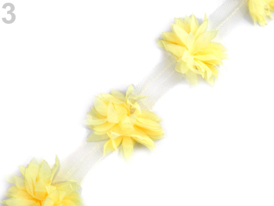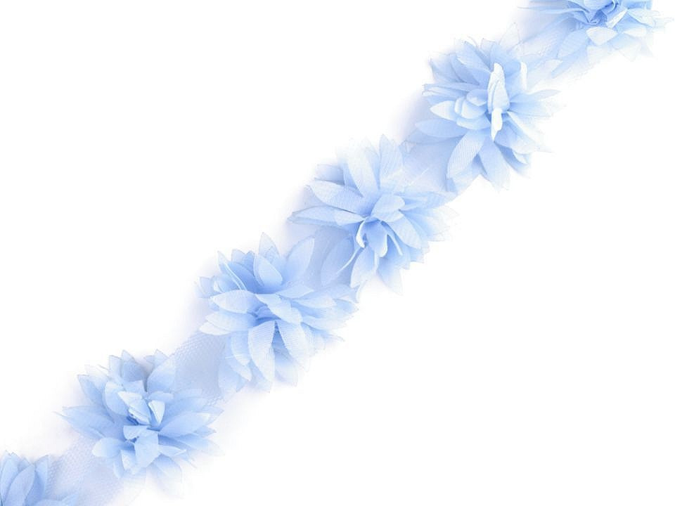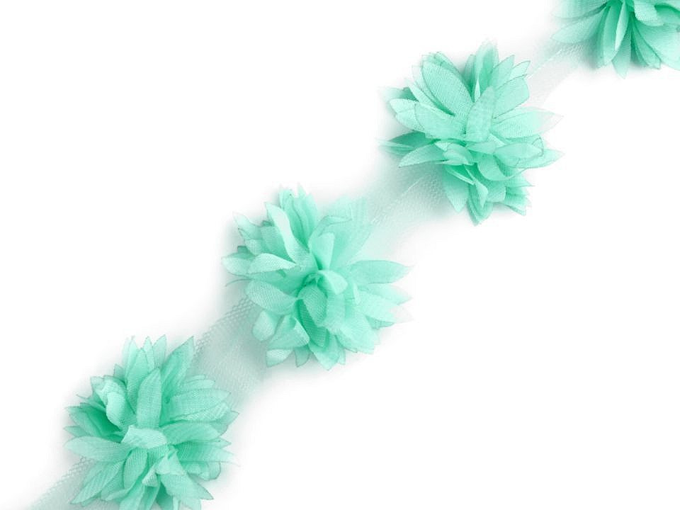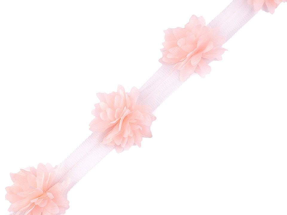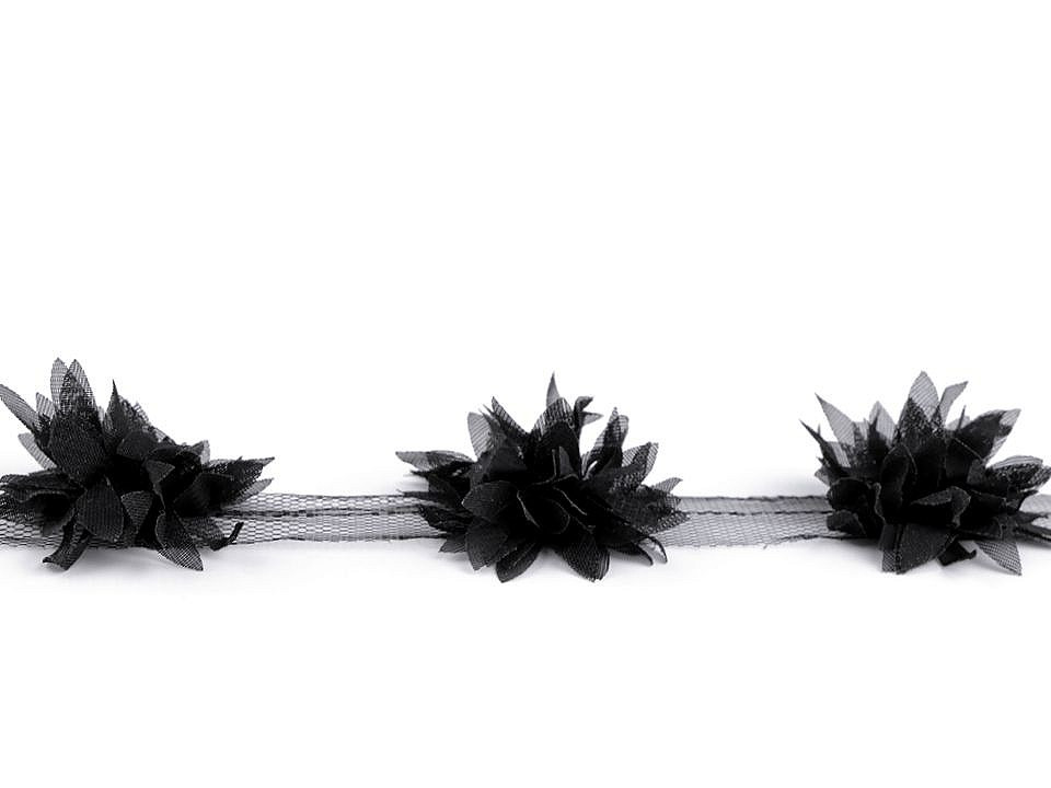 Prýmek na tylu je zdobený romantickými květy, které mají stejnou barvu jako podkladový tyl. Vzdálenost mezi květy záleží na barvě prýmku - pohybuje se od 6 do 9 cm (měřeno od středu ke středu květu).