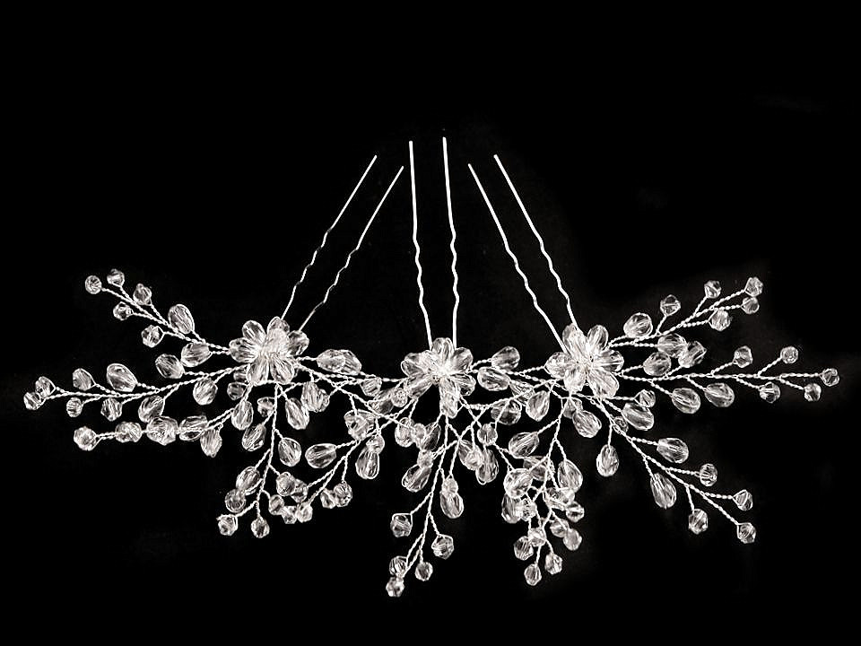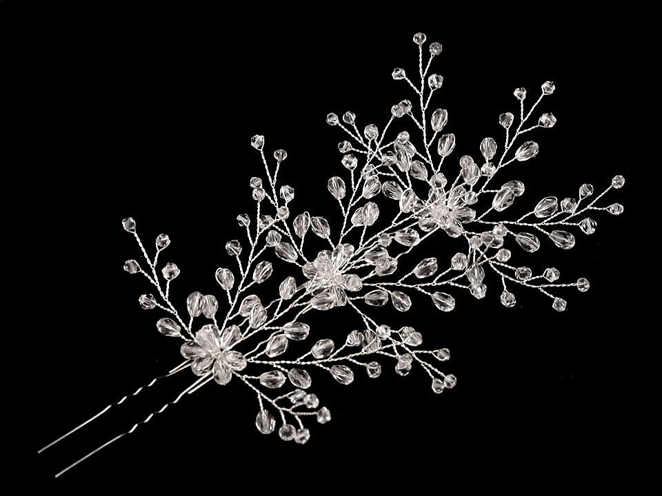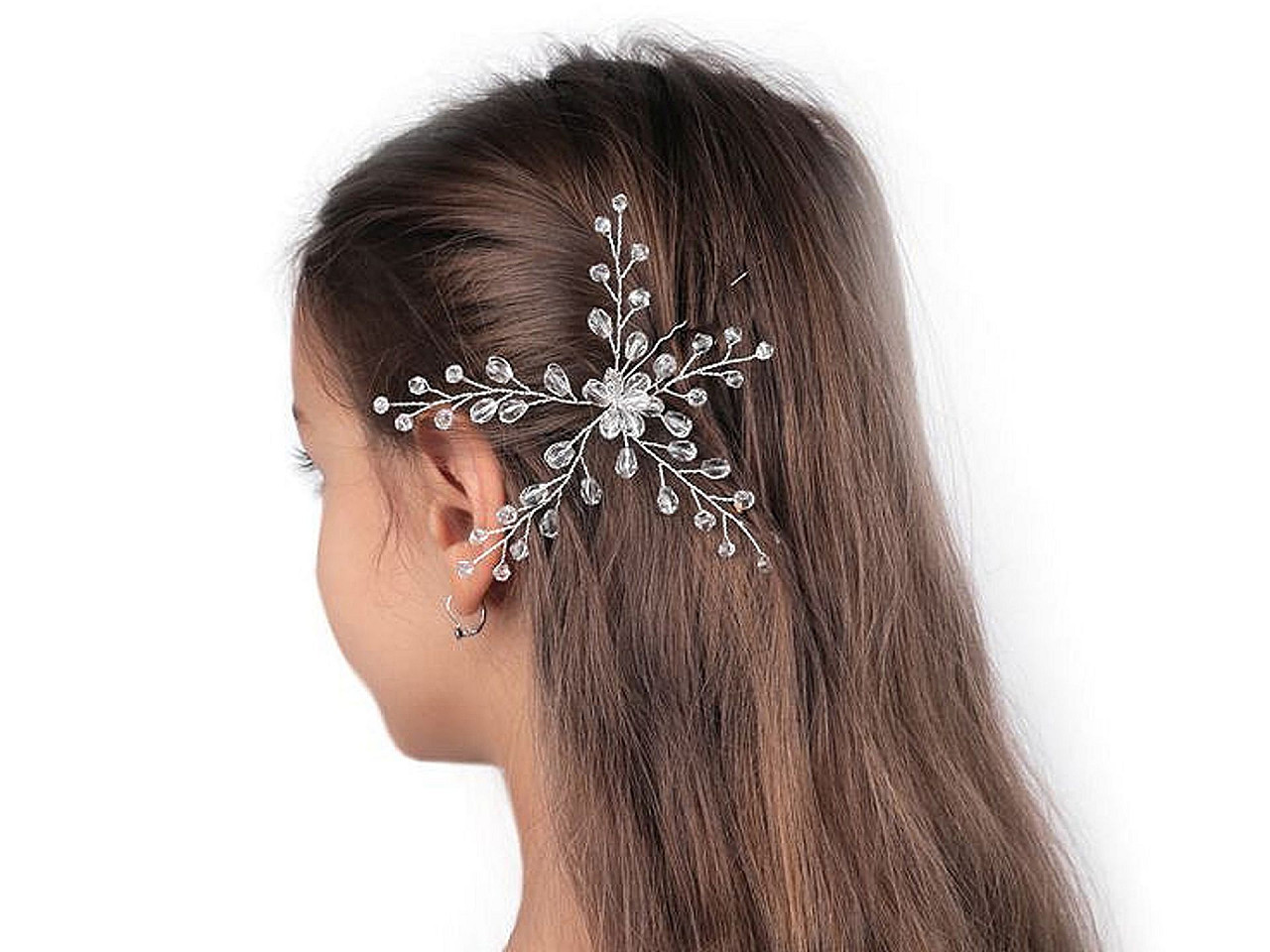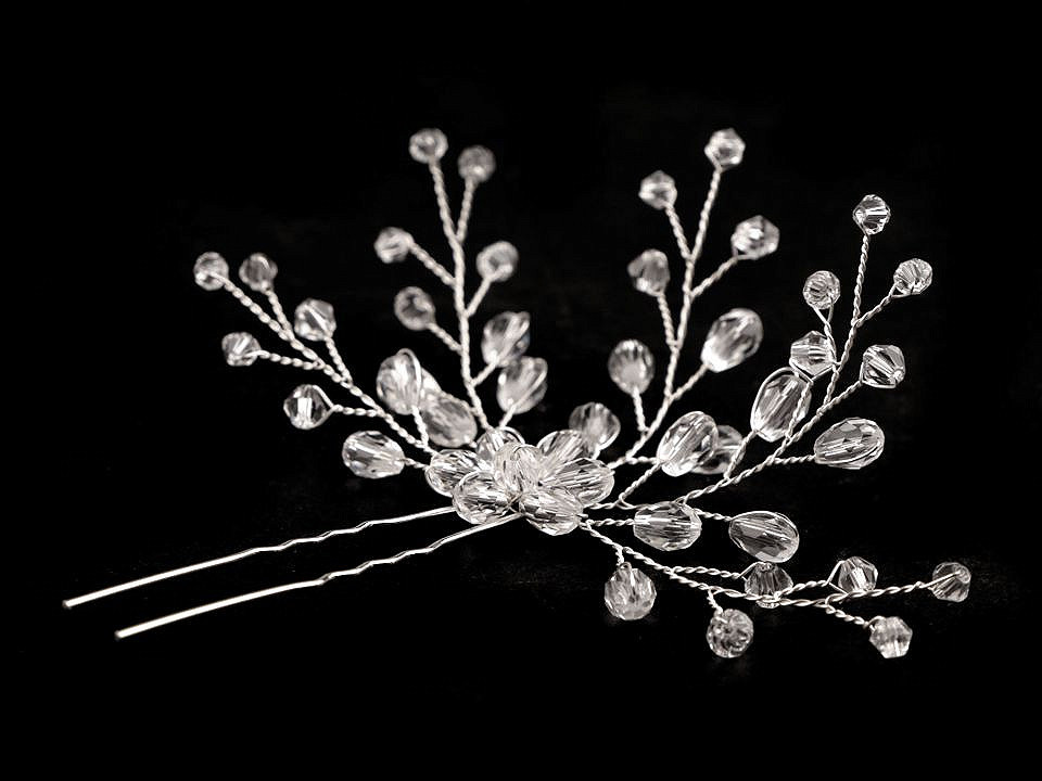 Elegantní vlásenka s broušenými korálky skvěle ozdobí slavnostní účes. Působí křehkou krásou, připomínající ledové království. Skleněné korálky se díky brusu jemně blýskají, celá ozdoba je ve vlasech nepřehlédnutelná. Díky drátkům ji můžete tvarovat. Je vhodná do společenských účesů i pro nevěsty v jejich den.