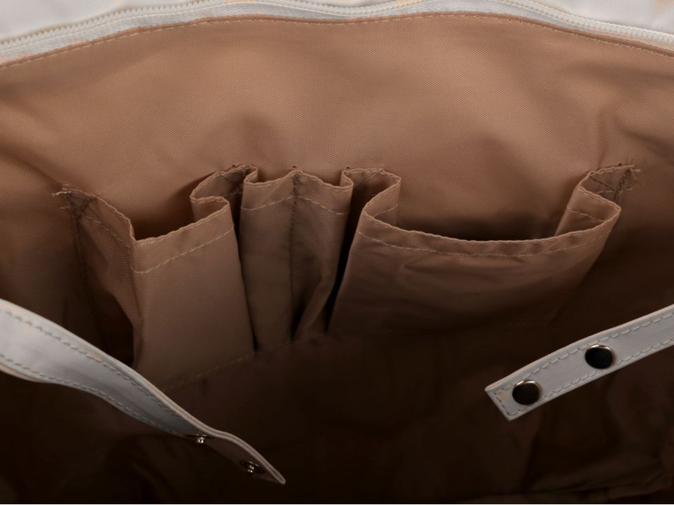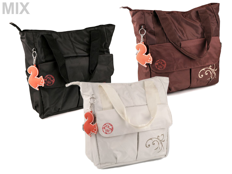 Je dostatečně prostorná, zavírá se na zip. Uvnitř má organizér na tužky, mobil. Na druhé straně je malá síťová kapsa na drobnosti, která se také zapíná na zip. Na přední straně jsou 2 kapsy na suchý zip. Taška je celá vyztužená. Na bocích má popruhy na zmenšení nebo rozšíření objemu tašky. Dvě ucha se hodí na rameno i do ruky. Na vnější kroužek můžete uchytit ozdoby nebo přívěsek. Dva přívěsky - veverka a logo HMG, jsou součástí tašky.