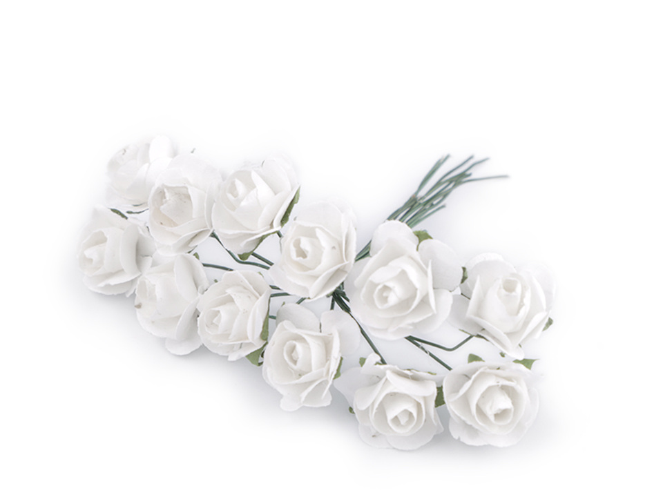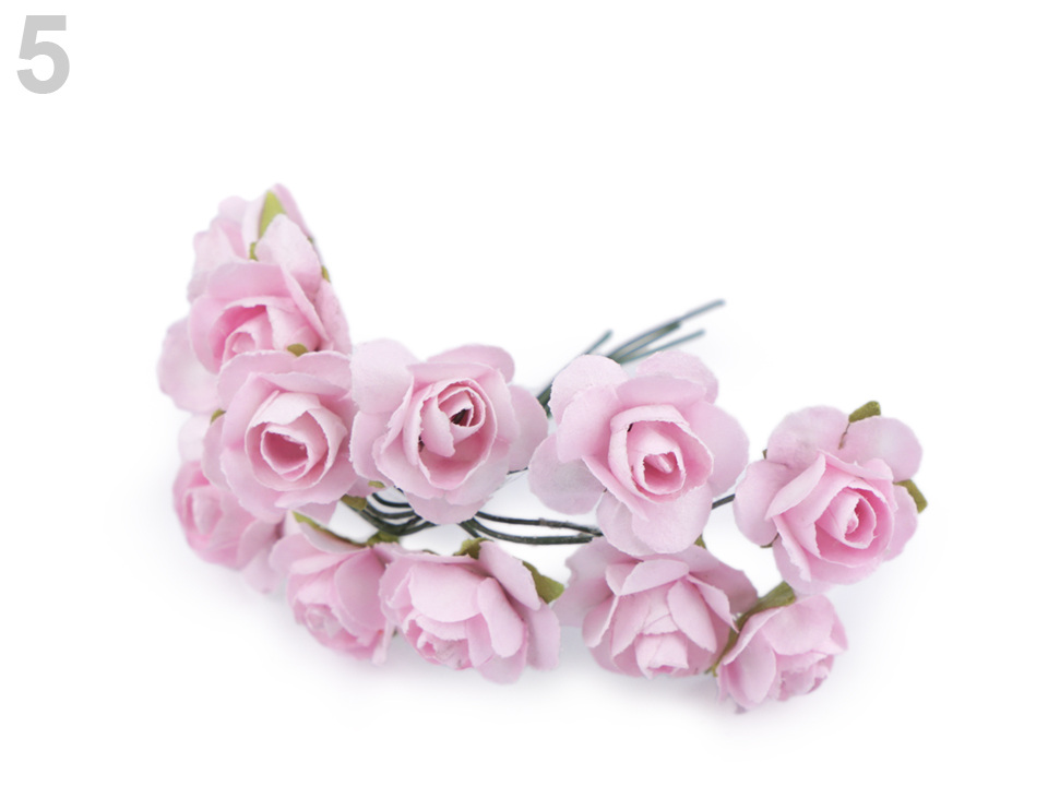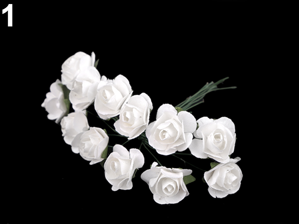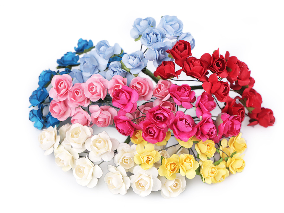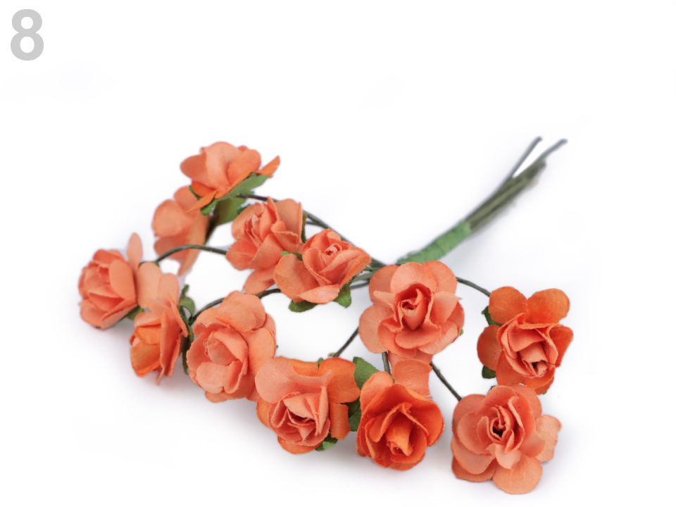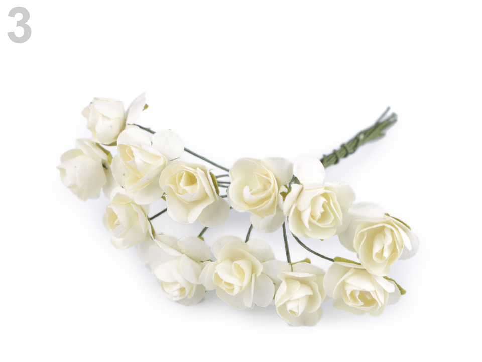 Drobné květy růže jsou připevněné k ohebnému drátku omotaném floristickou páskou, umožňující snadnou manipulaci a lehkou tvarovatelnost. Kvítky využijete při tvorbě věnců, květinových dekorací a aranžmá, voniček, čelenek či věnečků do vlasů.