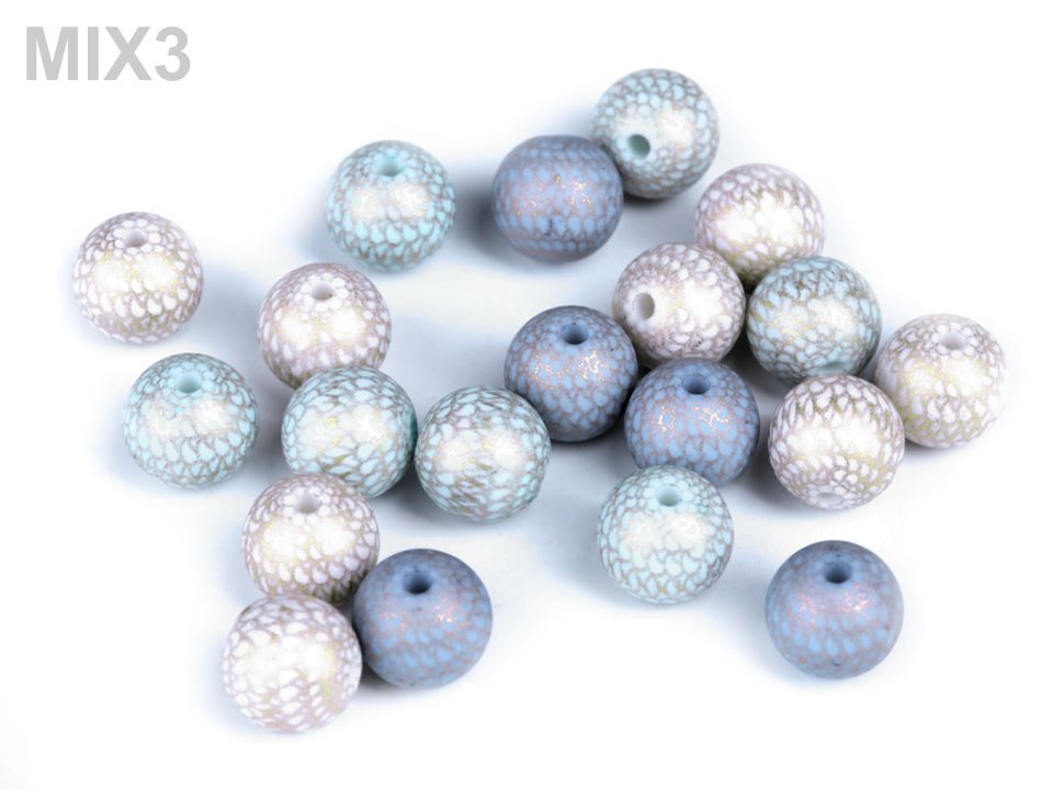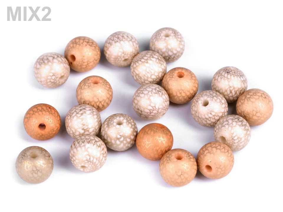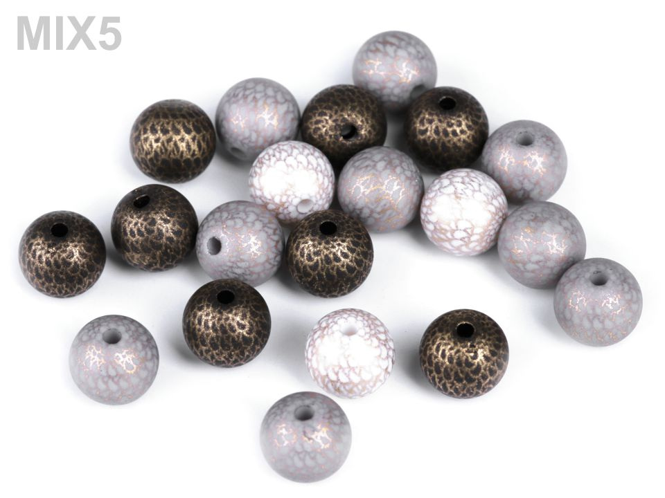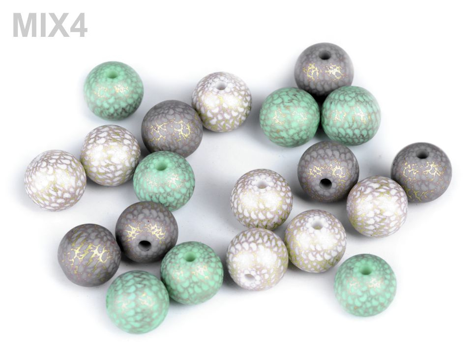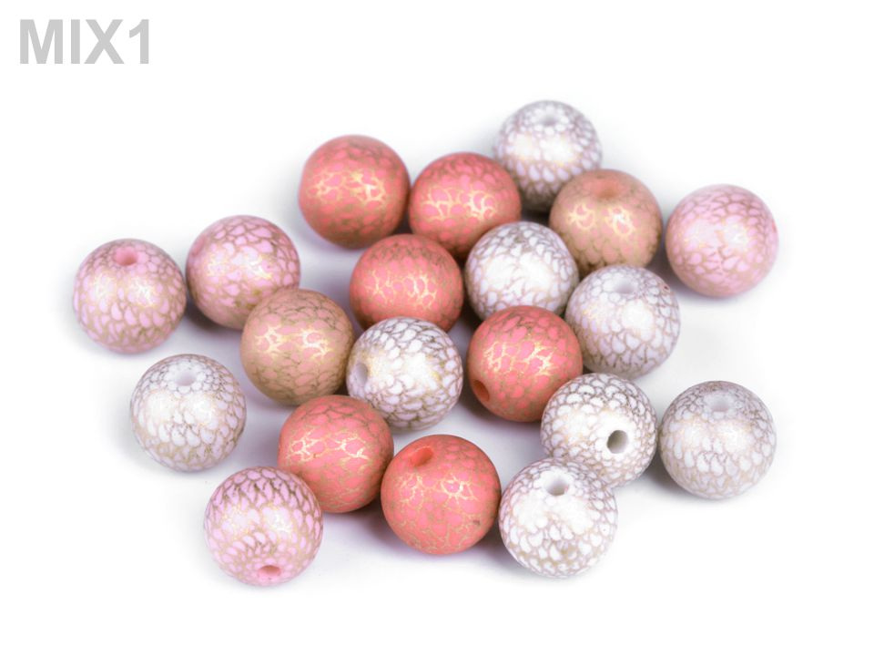 Plastové korálky se zlatým potiskem působí dojmem, jako kdyby na nich byla jemná kovová síťka. Vypadají velice efektně, jsou skvělé na výrobu náušnic a pružných náramků. Korálky jsou velice kvalitní, nemají žádné otřepení nebo viditelné švy. Jejich výhodou je nízká hmotnost, nemusíte se bát použít je do dlouhých náhrdelníků nebo náušnic.