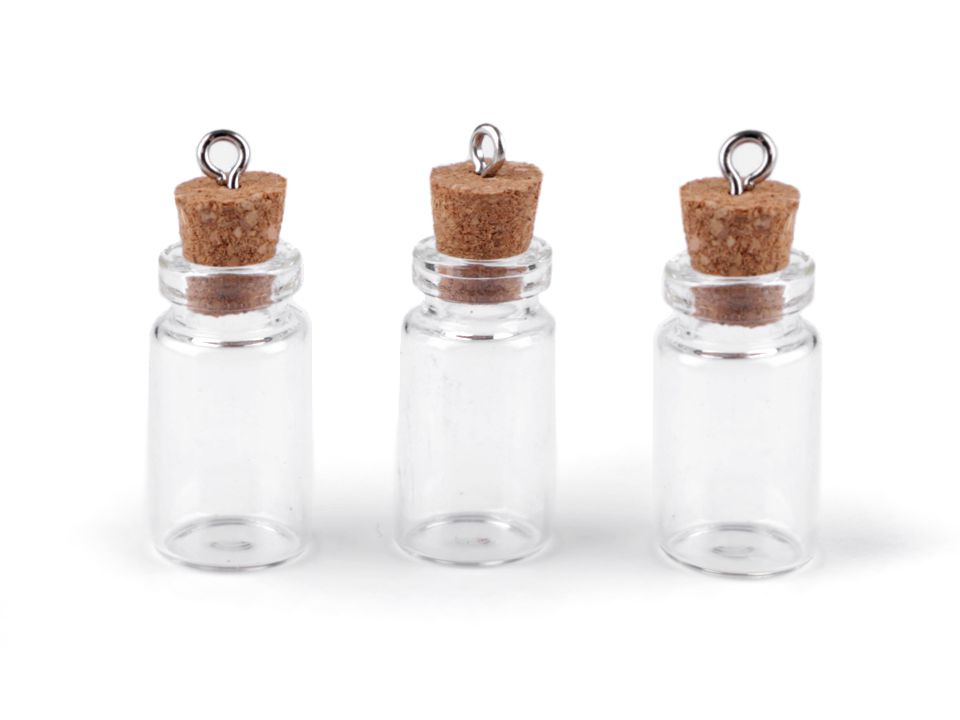 Drobná skleněná lahvička je vhodná především na výrobu šperků. Můžete ji naplnit drobnými perličkami, broušenými kamínky, glitry, jemným barevným pískem, úlomky minerálů, kamínků apod. Po naplnění doporučujeme korkovou zátku do hrdla vlepit, aby se při nošení lahvička samovolně neotevřela.