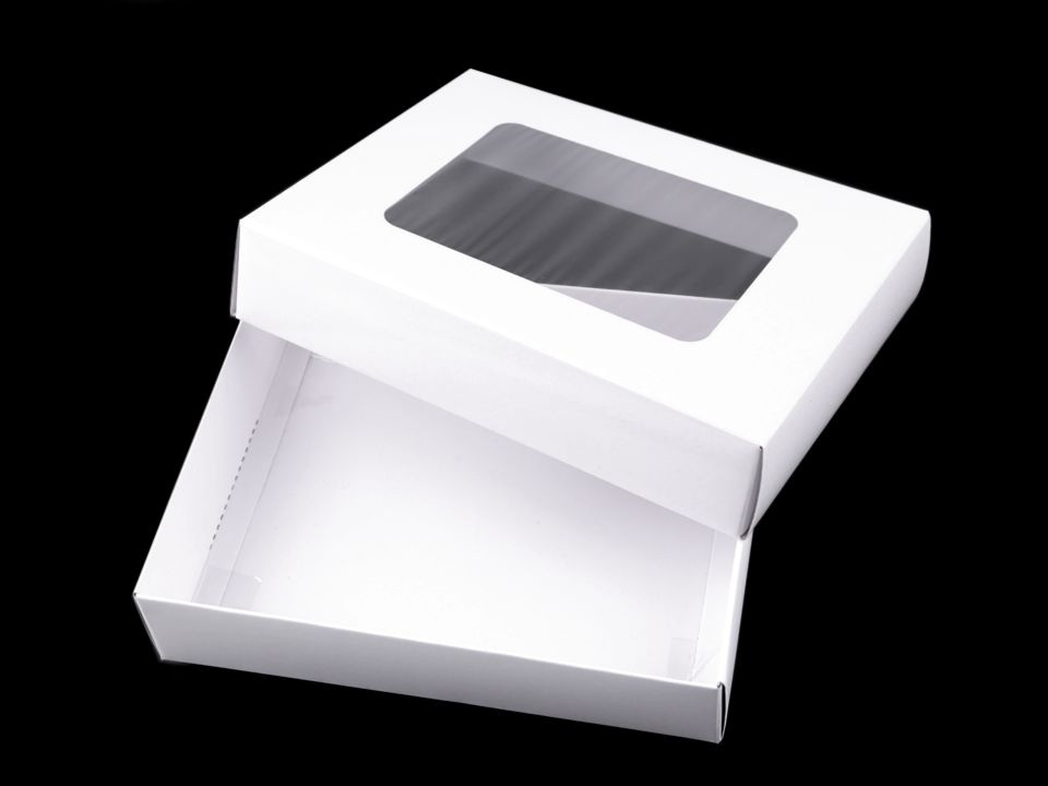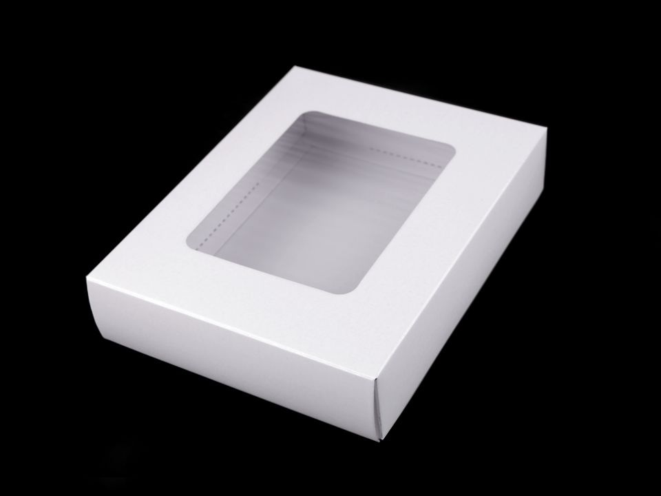 Dárková papírová krabice ve tvaru obdélníku. Výřez ve víku je z průhledné fólie. Její povrch je lesklý. Využijete ji na balení plochých dárků jako jsou šátky, peněženky apod. Můžete si ji i dozdobit podle svého vkusu.