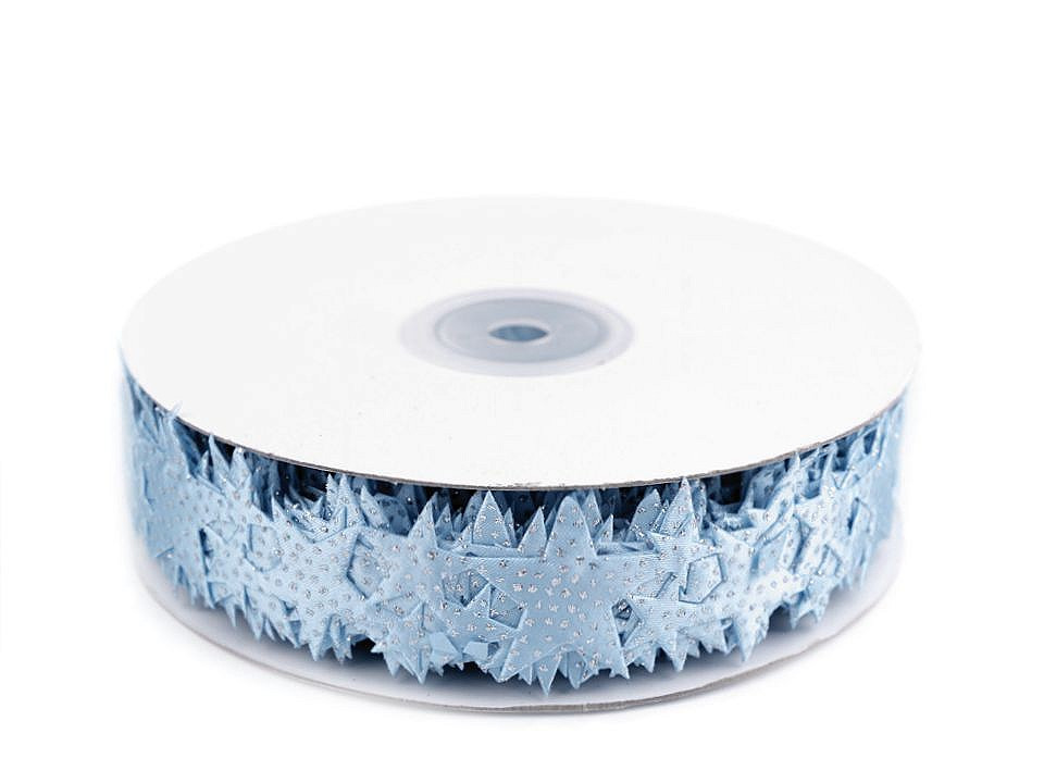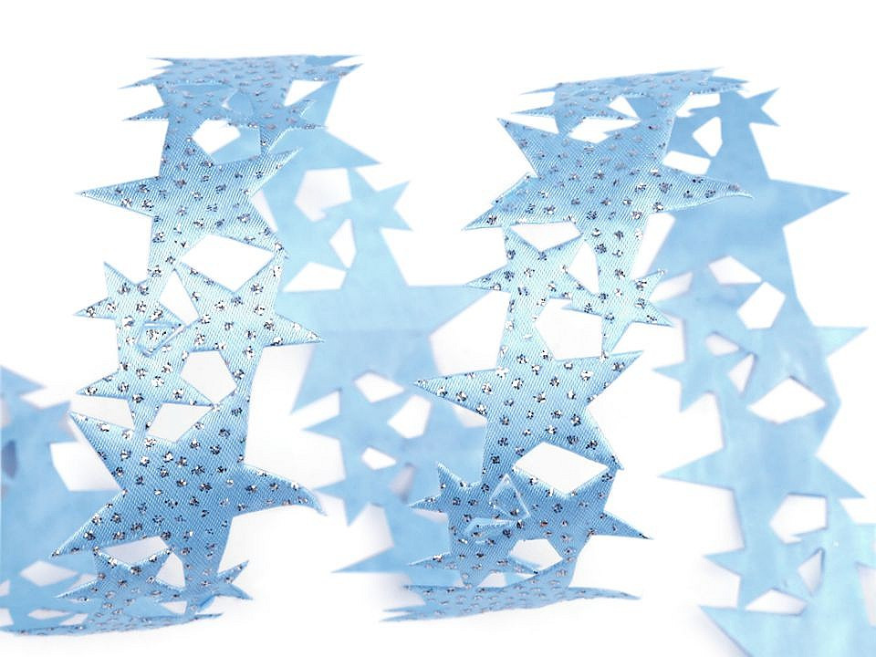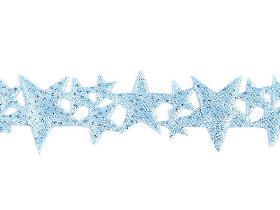 Saténový prýmek tvoří spojené hvězdy různých velikostí, které jsou ozdobené třpytivými glitry.