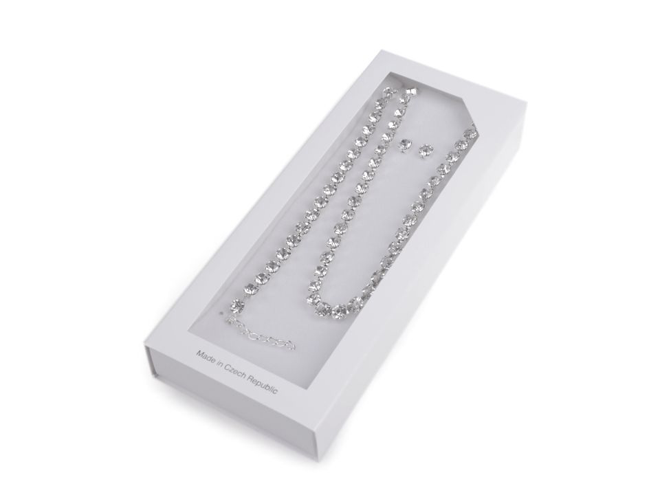 Soupravu prodáváme v dárkové krabičce. Je široká 8 cm, dlouhá je 20 cm. Její výška je 2,5 cm. Víko má průhled, hodí se pro vystavení šperků v obchodě.