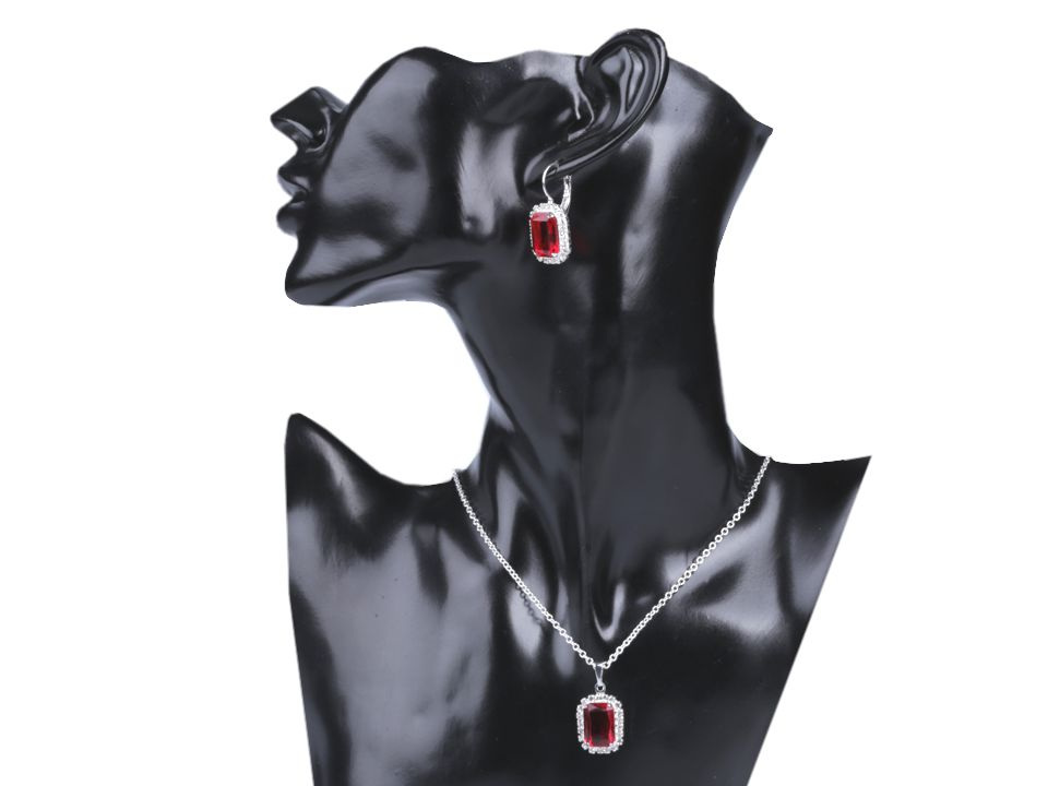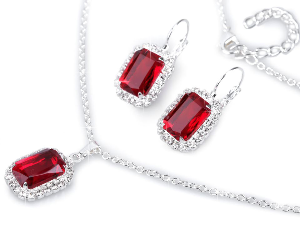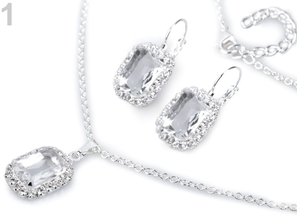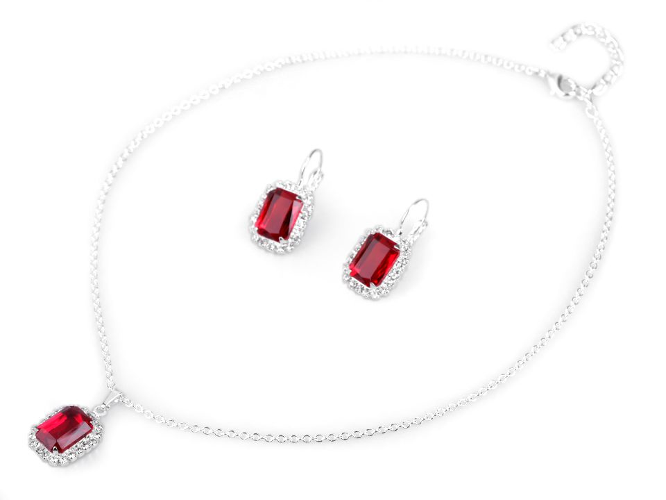Přívěsek s velkým kamenem a malými kamínky dokola je zavěšený na očkovém řetízku. Kámen je velký 1 x 1,2 cm, přívěsek je dlouhý 3 cm. Náhrdelník se zapíná na karabinku a prodlužovací řetízek. Náušnice mají stejný obdélníkový tvar a uzavřené mechanické zapínání. Jsou dlouhé 3 cm.