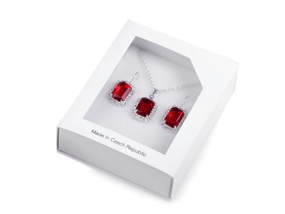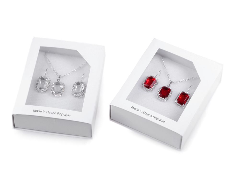 Soupravu prodáváme v dárkové krabičce. Je široká 8 cm, dlouhá je 10 cm. Její výška je 2,5 cm. Víko má průhled, hodí se pro vystavení šperků v obchodě.