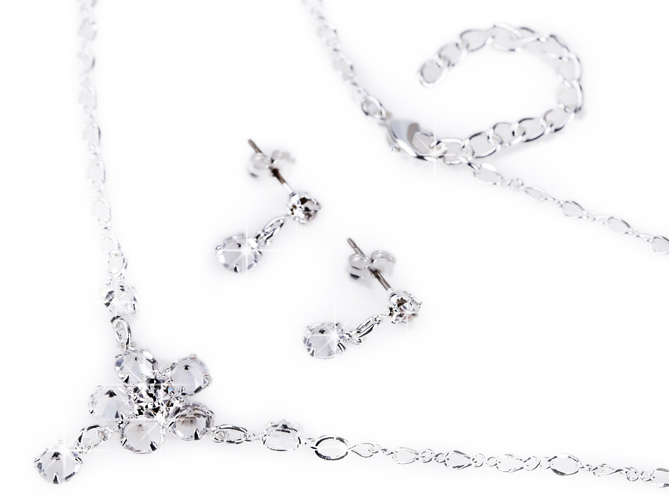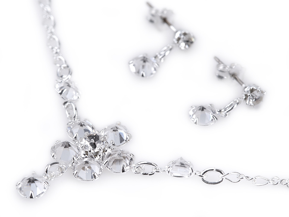 Decentní štrasový náhrdelník a náušnice z celosvětově proslavené jablonecké bižuterie využijete pro slavnostní příležitosti i běžné nošení. Vybroušené skleněné kamínky v kovovém lůžku jiskří při každém pohybu. Není mnoho šperků, které by takto snadno podtrhly ženskou krásu, jsou vhodné i pro nevěsty, nádherně doladí svatební šaty.