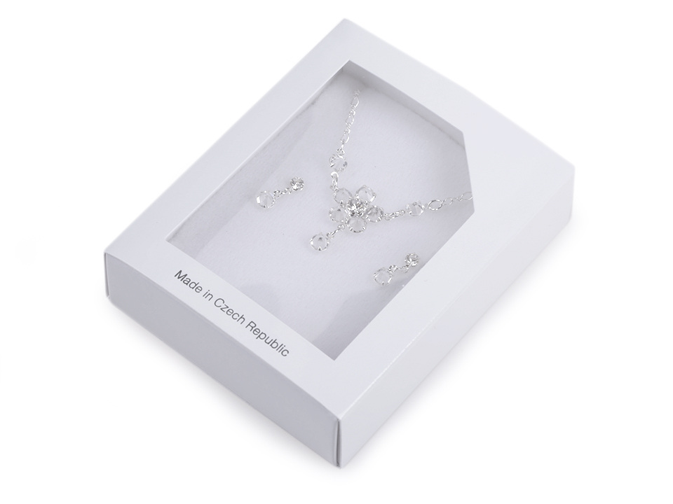 Soupravu prodáváme v dárkové krabičce. Je široká 8 cm, dlouhá je 10 cm. Její výška je 2,5 cm. Víko má průhled, hodí se pro vystavení šperků v obchodě.