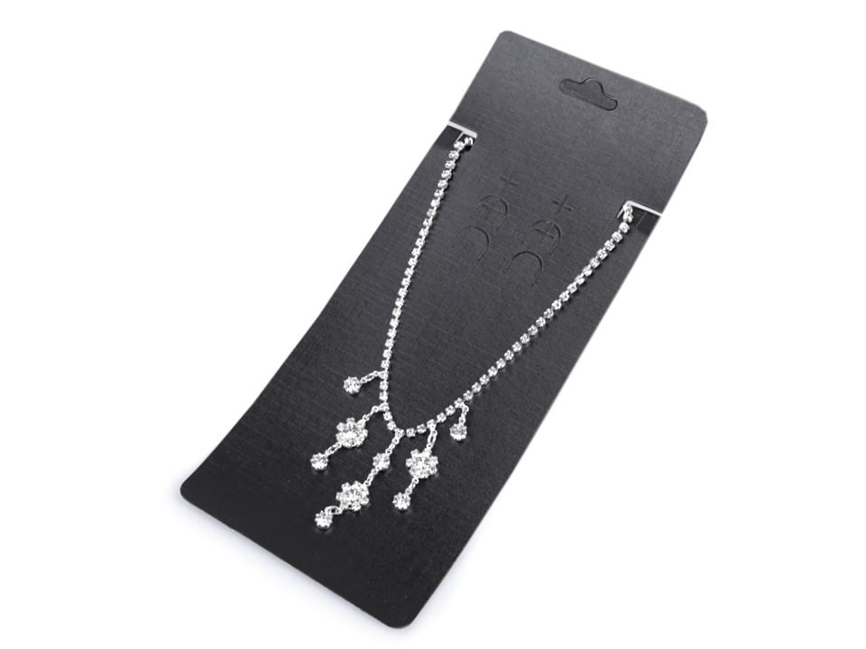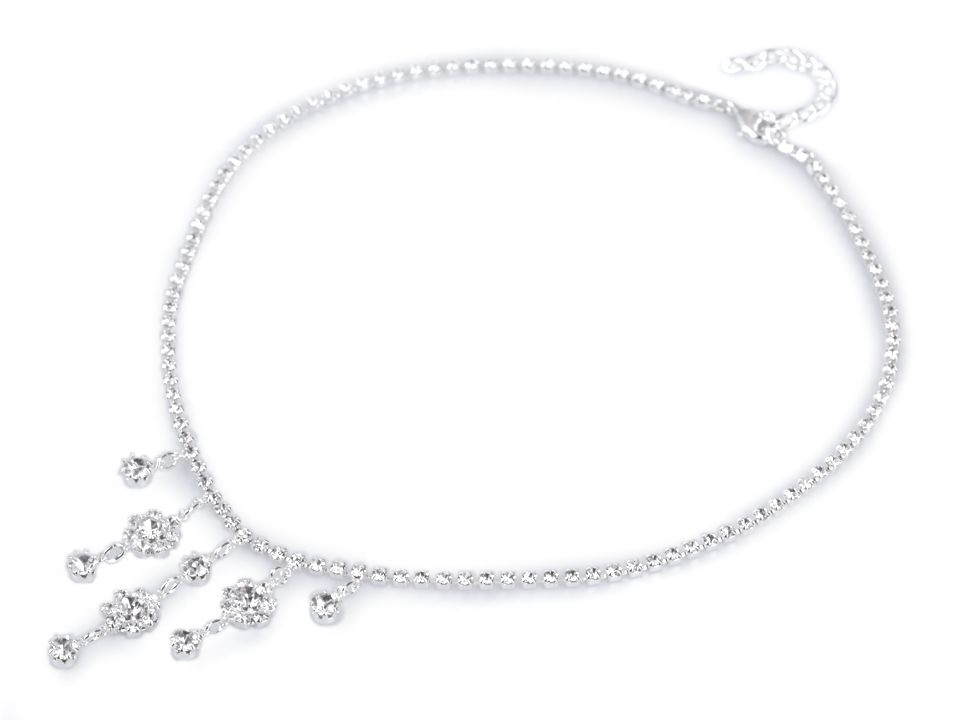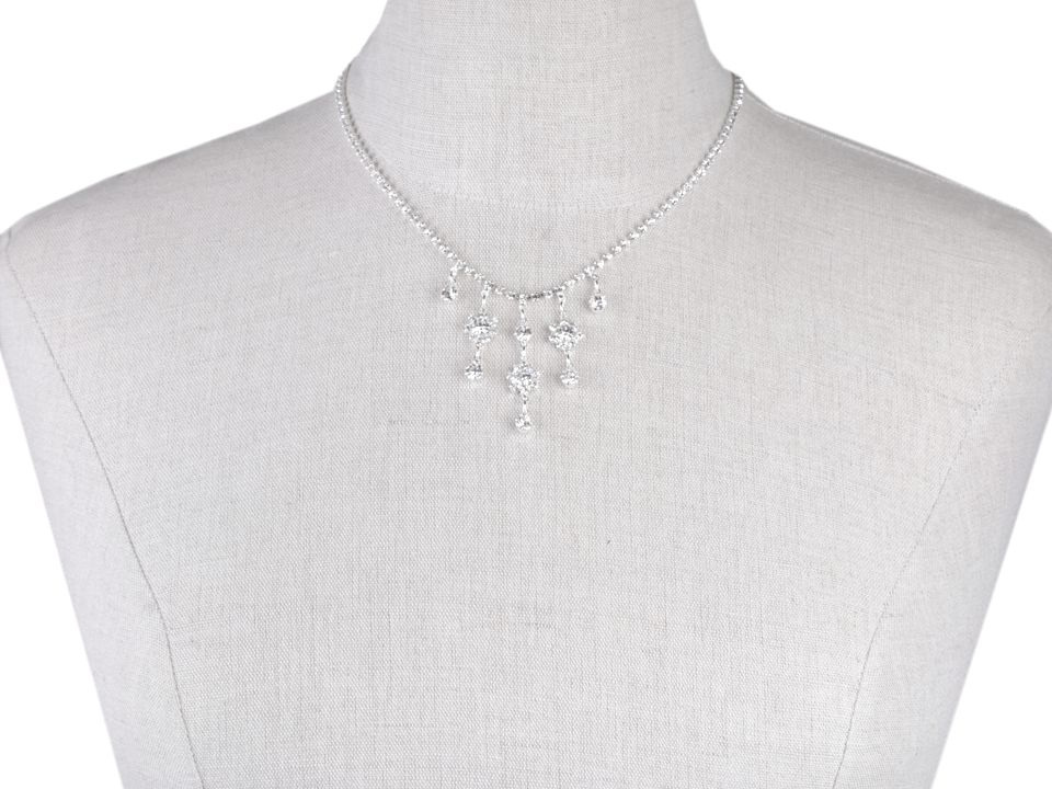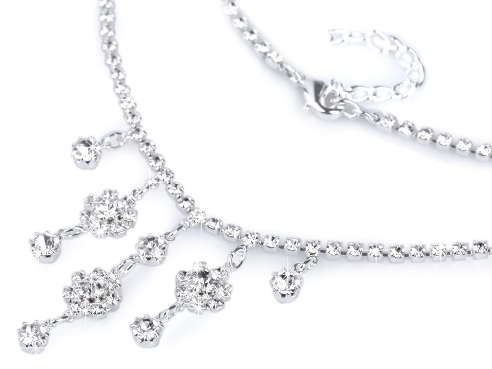 Náhrdelník z jednořadého štrasu je uprostřed ozdobený štrasovými střapci s květy. Střed je do tvaru trojúhelníku, je široký 4,5 cm, dlouhý 4 cm. Náhrdelník se zapíná na karabinku a prodlužovací řetízek.